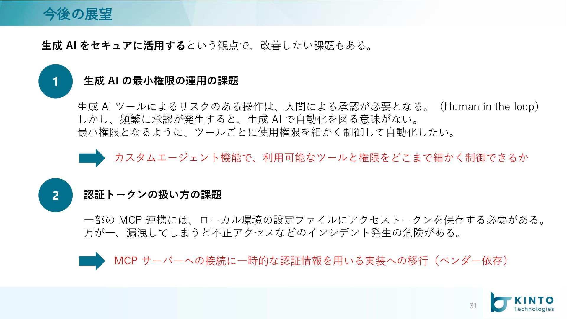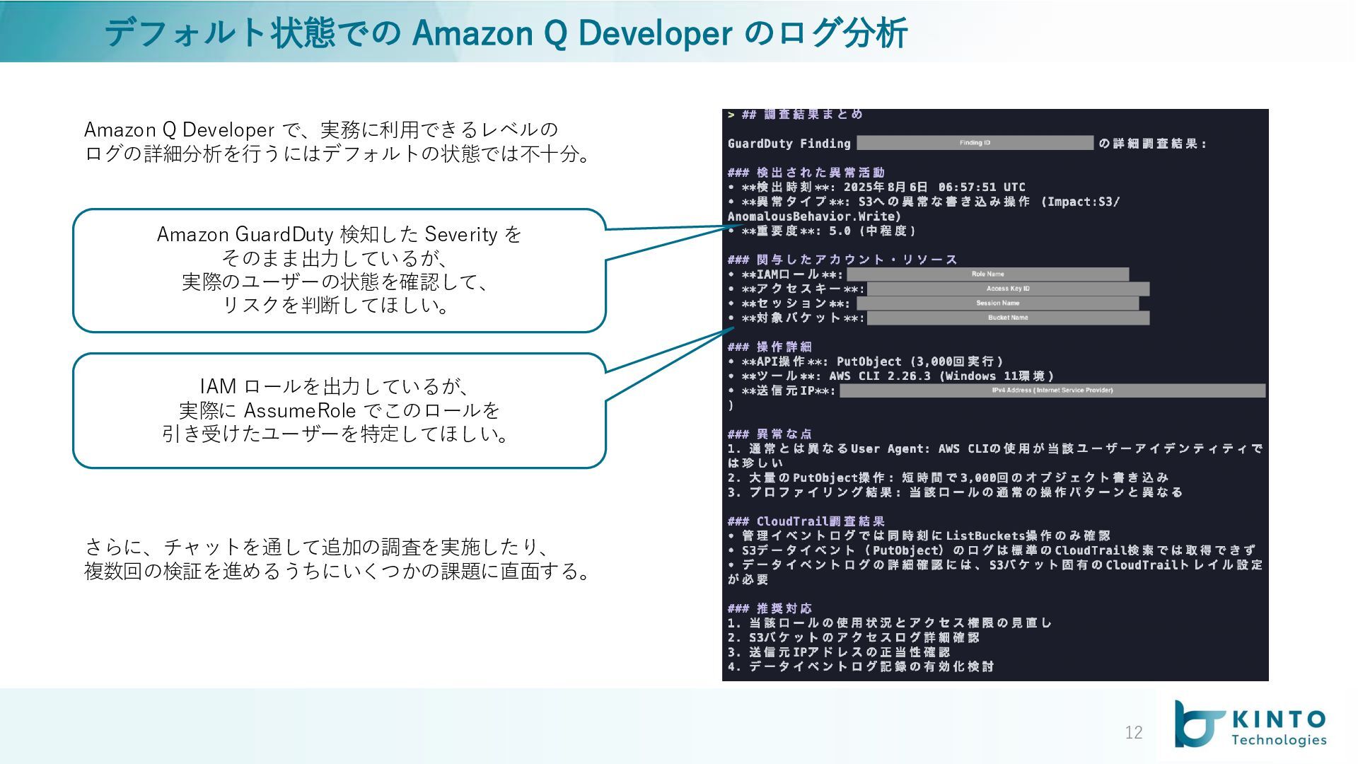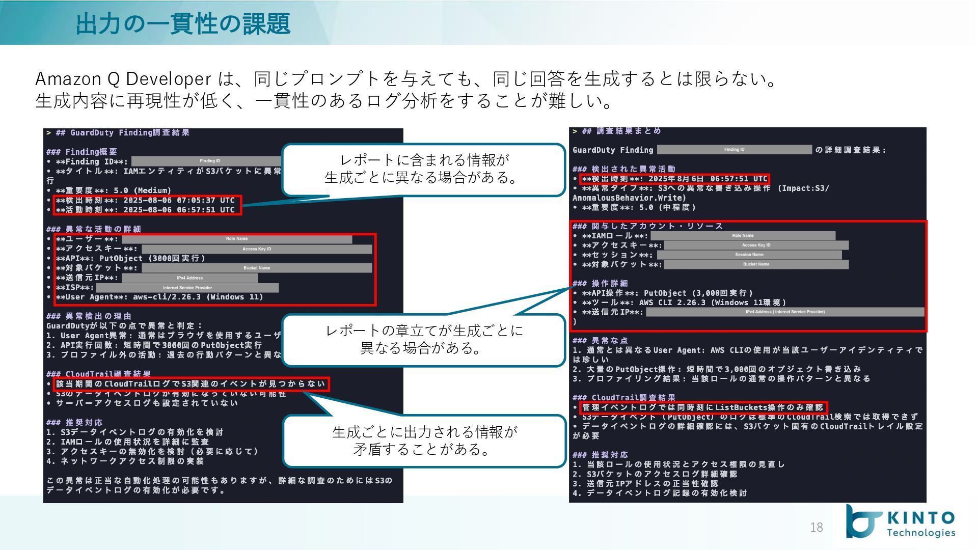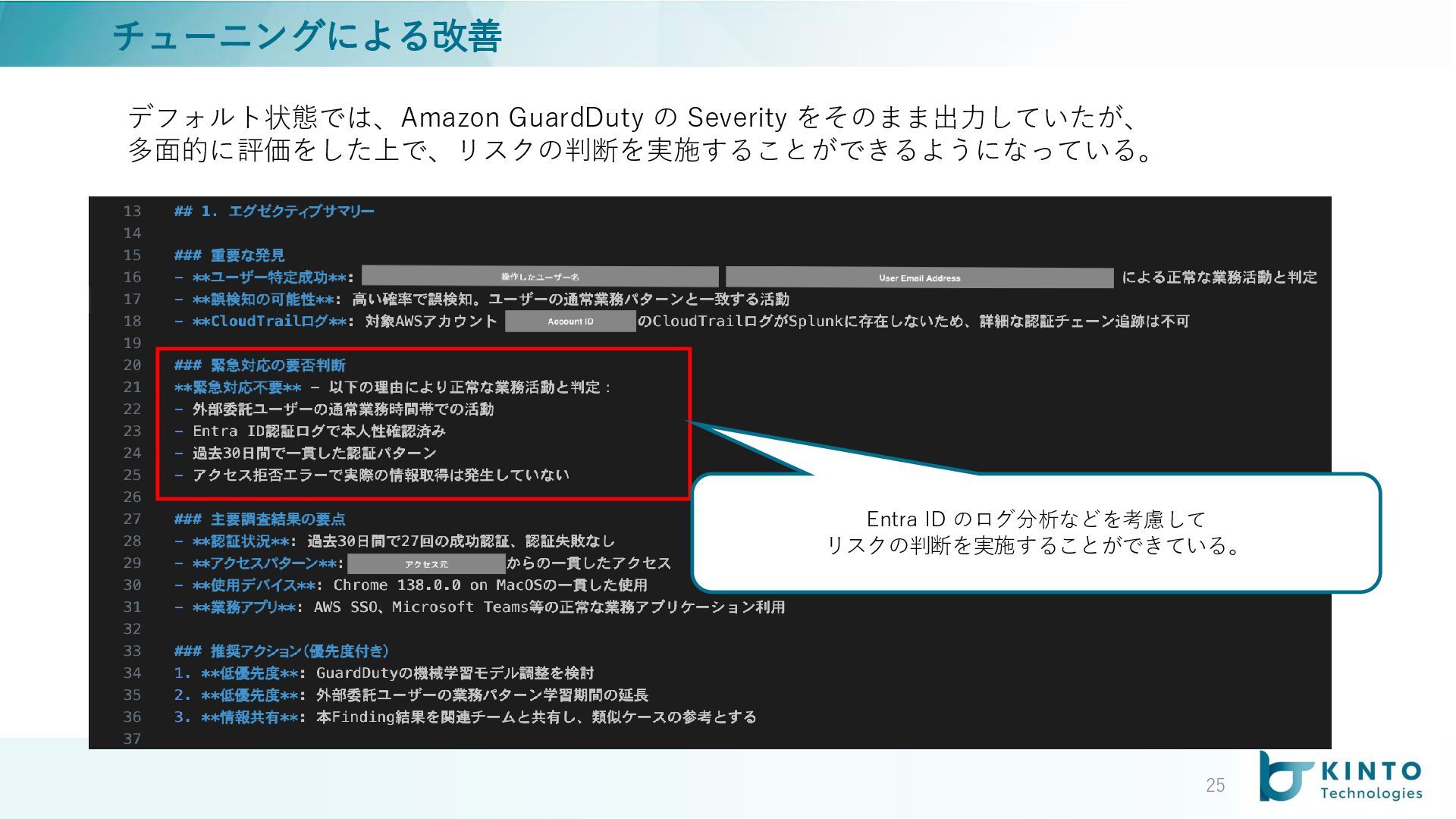 内容 具体例 システムの構成 ・どこにログが保存されているか ・どんなログが保存されているか CloudTrail のログは Splunk に保存されています。 ログの調査手順 ・どのツールを使用するか ・何を調査するのか Splunk MCP Server を使用して、該当ユーザーの脅 威検出時のログイン状況を調査してください。 出力形式 ・どの形式で出力するのか ・どんな情報を含めるのか レポートは、Markdown 形式で出力してください。 レポートは、次の章立てで作成してください コマンドの具体例 ・Splunk の検索クエリなど 認証状況の確認では、以下のコマンドを実行してください。 ‘index=example userPrincipalName=“<メールアドレス>” | stats count by status.errorCode, status.failureReason |sort -count' 禁止事項の明記 ・実行してはいけない操作は何か ・出力に含めない内容は何か ・推測や仮定に基づく関連付けはしないでください。 ・自分で日付から曜日を計算しないでください。