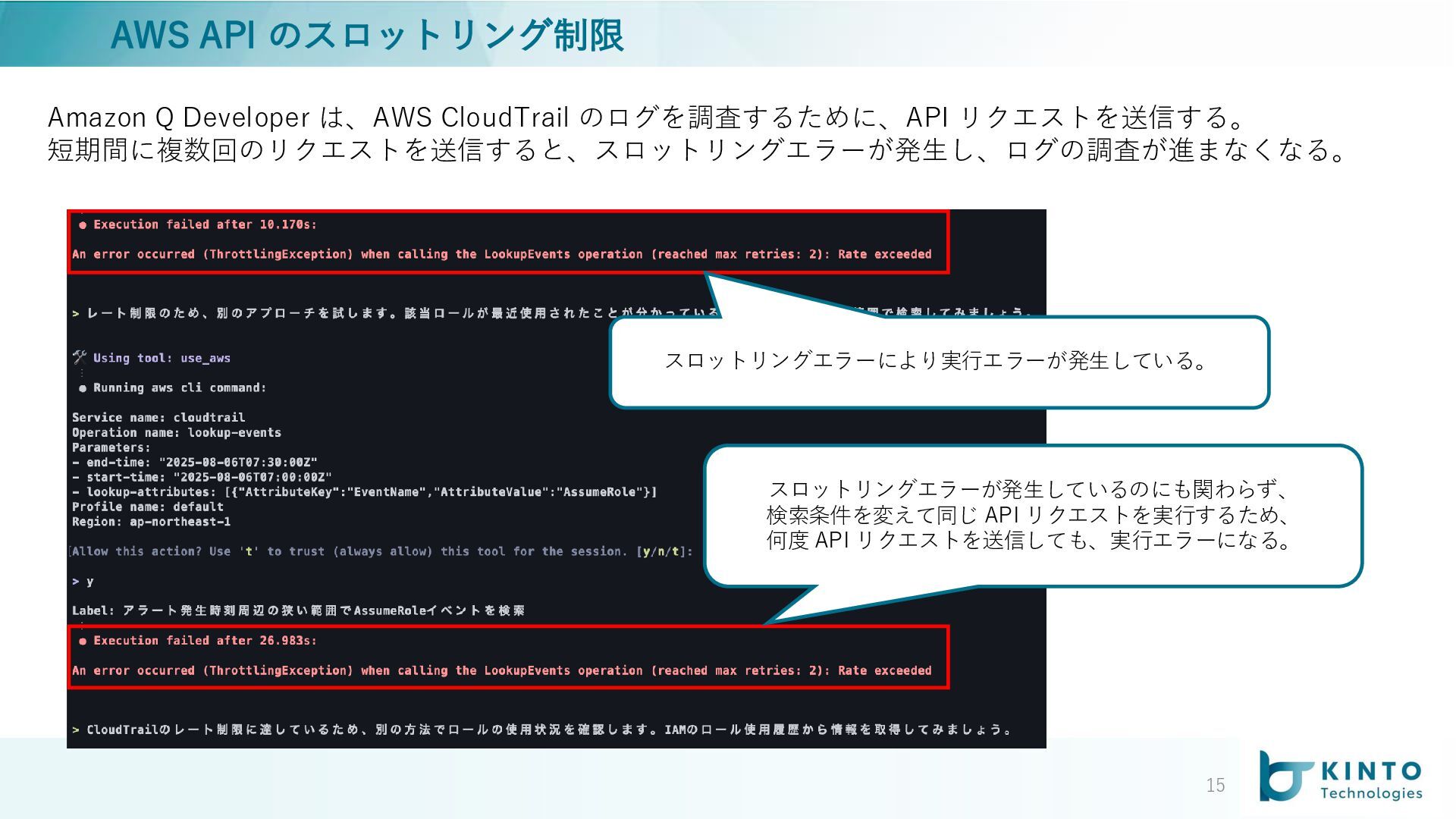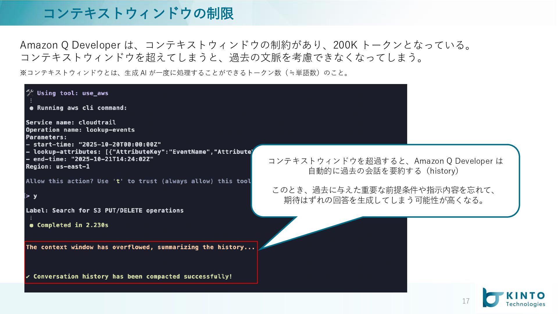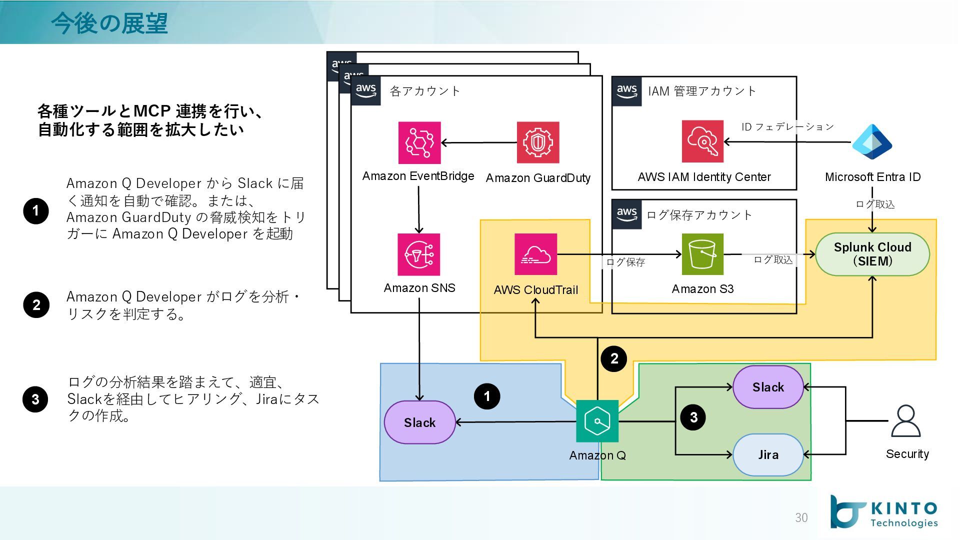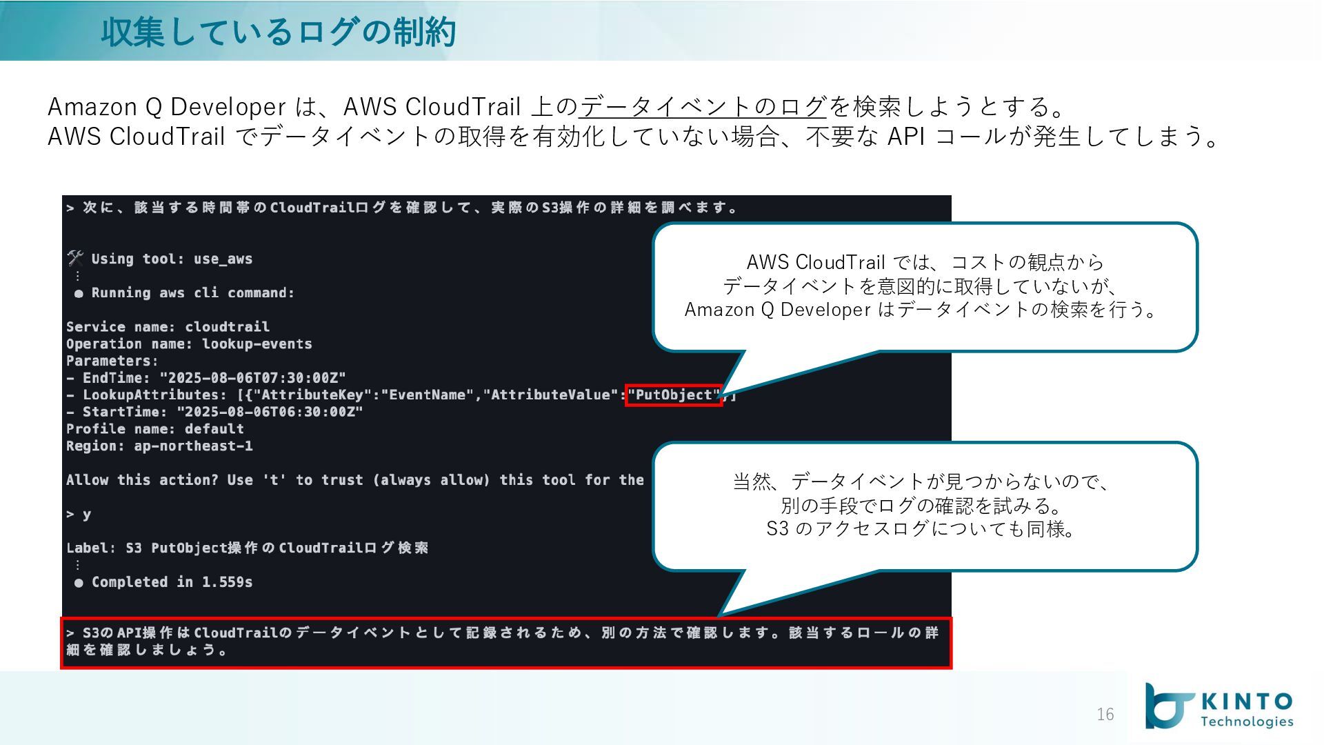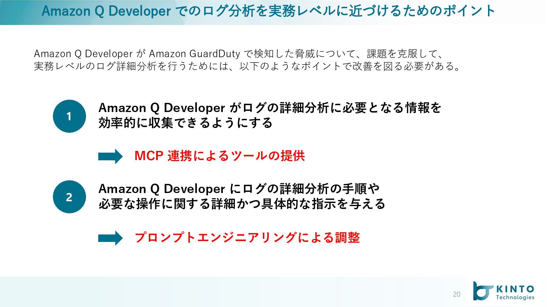 内容 具体例 システムの構成 ・どこにログが保存されているか ・どんなログが保存されているか CloudTrail のログは Splunk に保存されています。 ログの調査手順 ・どのツールを使用するか ・何を調査するのか Splunk MCP Server を使用して、該当ユーザーの脅 威検出時のログイン状況を調査してください。 出力形式 ・どの形式で出力するのか ・どんな情報を含めるのか レポートは、Markdown 形式で出力してください。 レポートは、次の章立てで作成してください コマンドの具体例 ・Splunk の検索クエリなど 認証状況の確認では、以下のコマンドを実行してください。 ‘index=example userPrincipalName=“<メールアドレス>” | stats count by status.errorCode, status.failureReason |sort -count' 禁止事項の明記 ・実行してはいけない操作は何か ・出力に含めない内容は何か ・推測や仮定に基づく関連付けはしないでください。 ・自分で日付から曜日を計算しないでください。