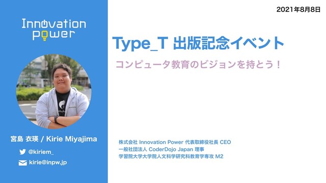 ٶౡҥӯ,JSJF.JZBKJNB !LJSJFN@ LJSJF!JOQXKQ גࣜձࣾ*OOPWBUJPO1PXFSදऔకࣾ$&0 Ұൠࣾஂ๏ਓ$PEFS%PKP+BQBOཧࣄ ֶशӃେֶେֶӃਓจՊֶݚڀՊڭҭֶઐ߈. ݄ 5ZQF@5ग़൛ه೦Πϕϯτ ίϯϐϡʔλڭҭͷϏδϣϯΛ࣋ͱ͏ʂ