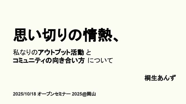 思い切りの情熱、 私なりのアウトプット活動 と コミュニティの向き合い方 について 桐生あんず 2025/10/18 オープンセミナー 2025@岡山
