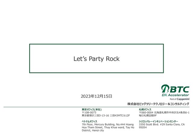Hoang Hoa Tham Street, Thuy Khue ward, Tay Ho District, Hanoi city 札幌オフィス 〒060-0004 北海道札幌市中央区北4条西6-1 毎日札幌会館9F シリコンバレーインキュベーションセンター 3350 Scott Blvd. #29 Santa Clara, CA 95054 株式会社ビッグツリーテクノロジー&コンサルティング Let’s Party Rock 2023年12月15日