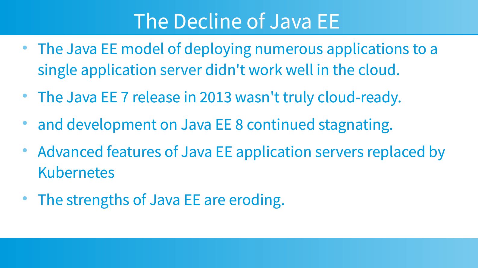 of deploying numerous applications to a single application server didn't work well in the cloud. • The Java EE 7 release in 2013 wasn't truly cloud-ready. • and development on Java EE 8 continued stagnating. • Advanced features of Java EE application servers replaced by Kubernetes • The strengths of Java EE are eroding.