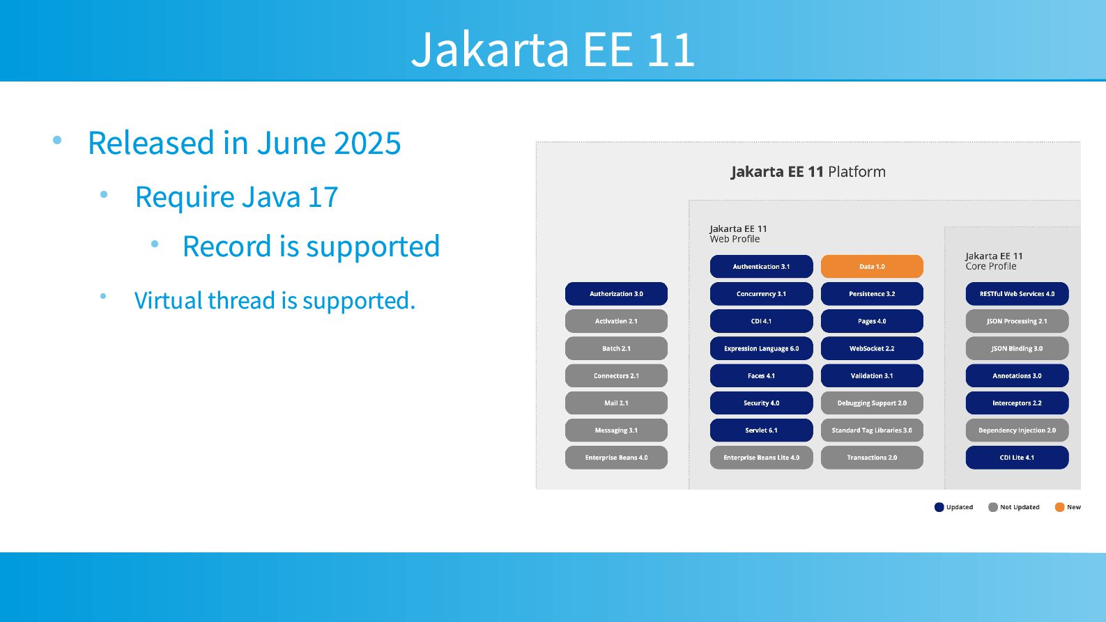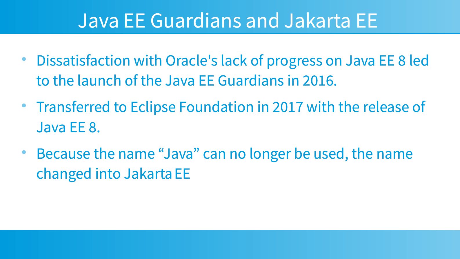 lack of progress on Java EE 8 led to the launch of the Java EE Guardians in 2016. • Transferred to Eclipse Foundation in 2017 with the release of Java EE 8. • Because the name “Java” can no longer be used, the name changed into Jakarta EE