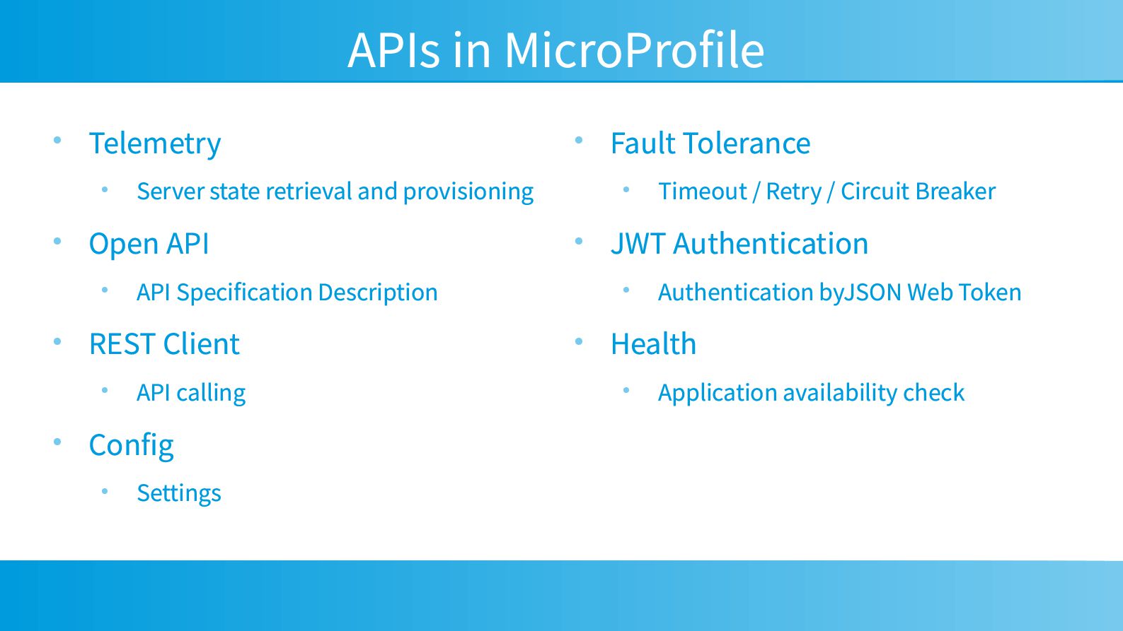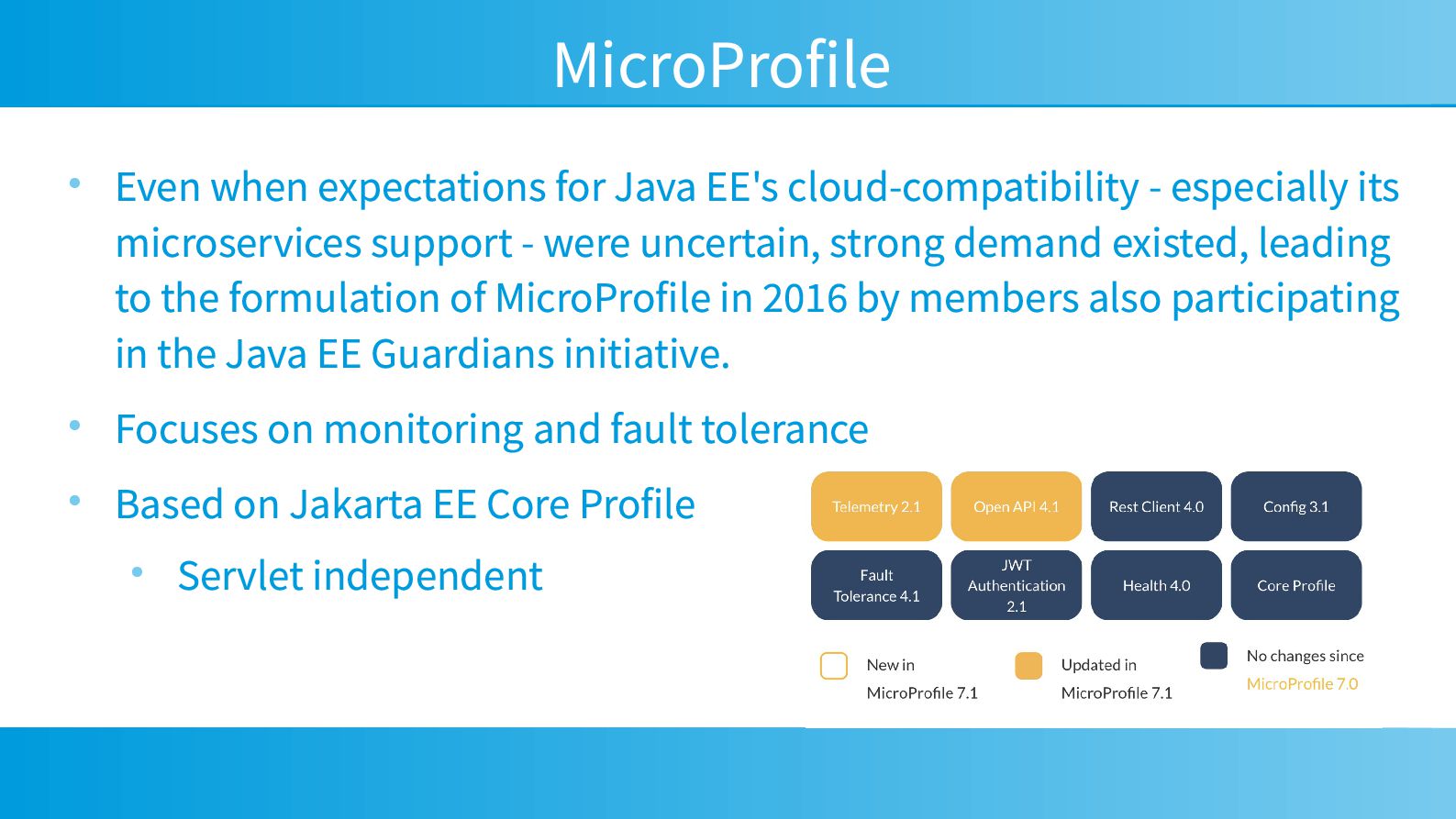 especially its microservices support - were uncertain, strong demand existed, leading to the formulation of MicroProfile in 2016 by members also participating in the Java EE Guardians initiative. • Focuses on monitoring and fault tolerance • Based on Jakarta EE Core Profile • Servlet independent