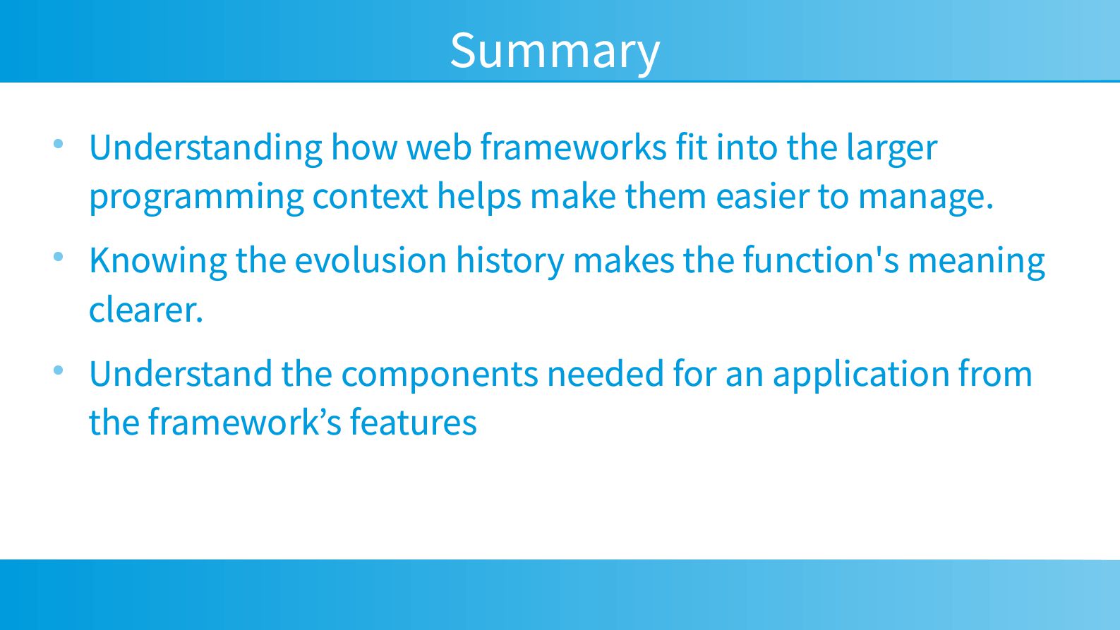 programming context helps make them easier to manage. • Knowing the evolusion history makes the function's meaning clearer. • Understand the components needed for an application from the framework’s features