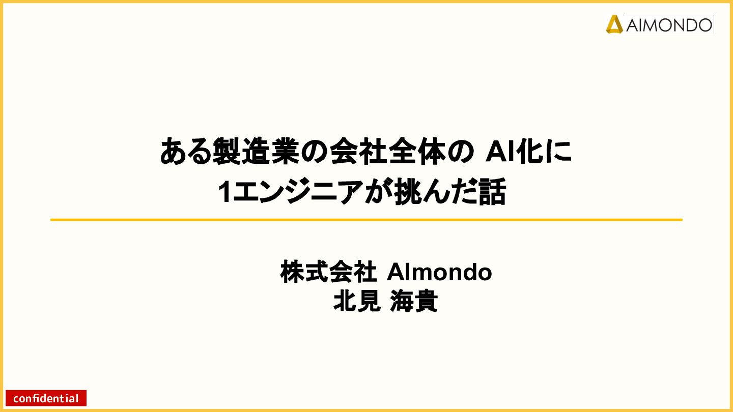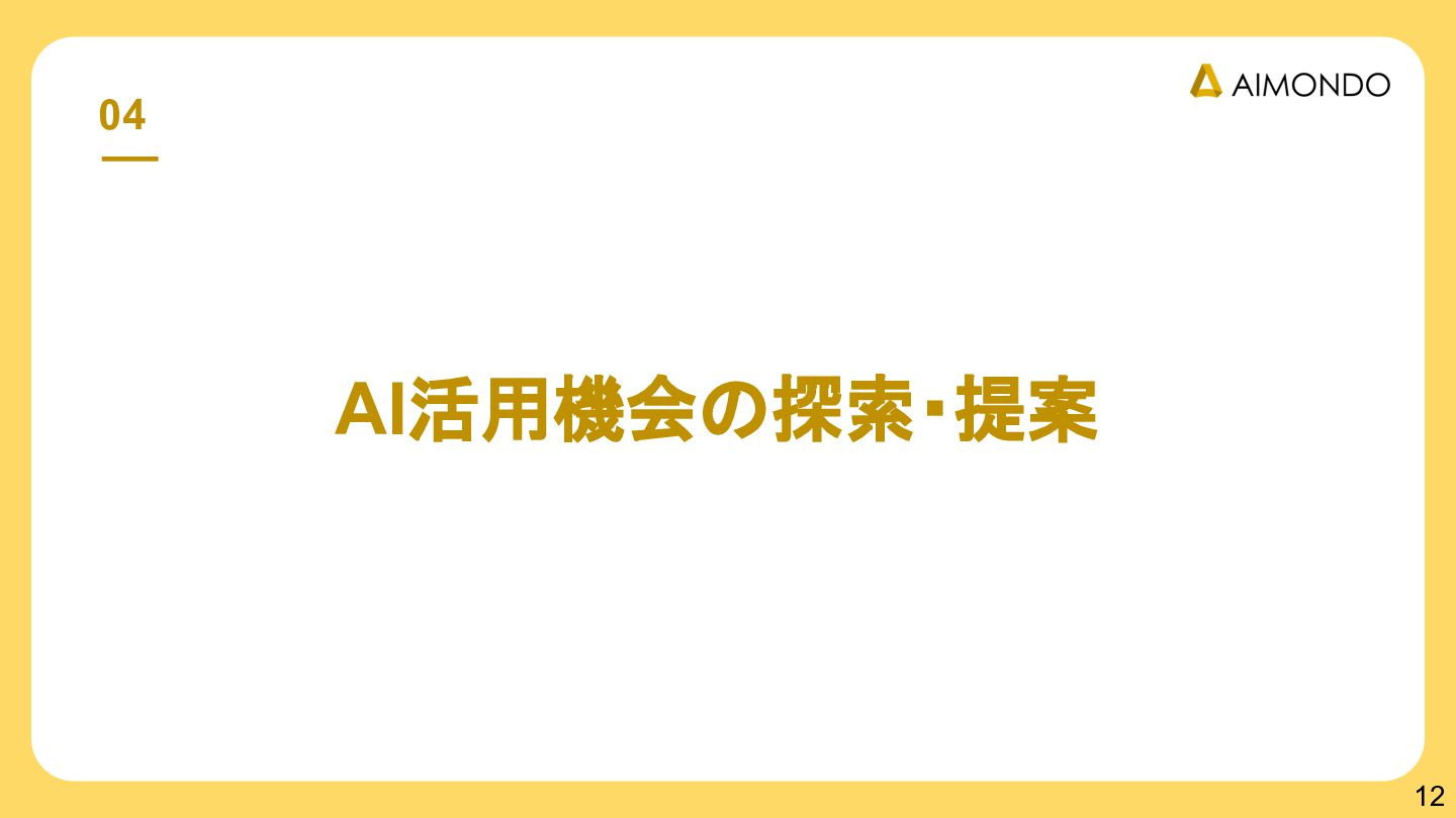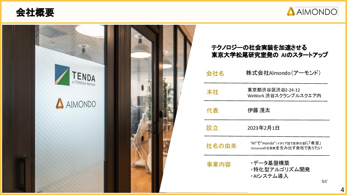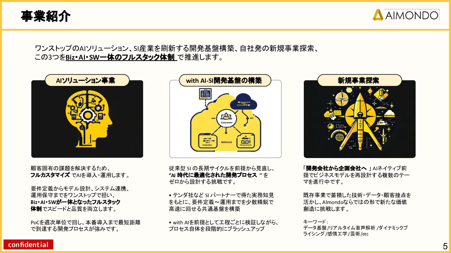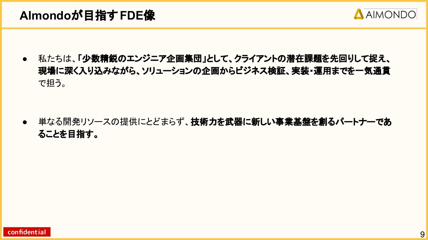要件定義からモデル設計、システム連携、 運用保守までをワンストップで担い、 Biz・AI・SWが一体となったフルスタック 体制でスピードと品質を両立します。 PoCを週次単位で回し、本番導入まで最短距離 で到達する開発プロセスが強みです。 with AI-SI開発基盤の構築 従来型 SI の長期サイクルを前提から見直し、 “AI 時代に最適化された開発プロセス ” を ゼロから設計する挑戦です。 • テンダ社など SI パートナーで得た実務知見 をもとに、要件定義〜運用までを少数精鋭で 高速に回せる共通基盤を構築 • with AIを前提として工程ごとに検証しながら、 プロセス自体を段階的にブラッシュアップ 新規事業探索 「開発会社から企画会社へ 」 AIネイティブ前 提でビジネスモデルを再設計する複数のテー マを進行中です。 既存事業で蓄積した技術・データ・顧客接点を 活かし、Almondoならではの形で新たな価値 創造に挑戦します。 キーワード: データ基盤/リアルタイム音声解析 /ダイナミックプ ライシング/感情工学/芸術/etc