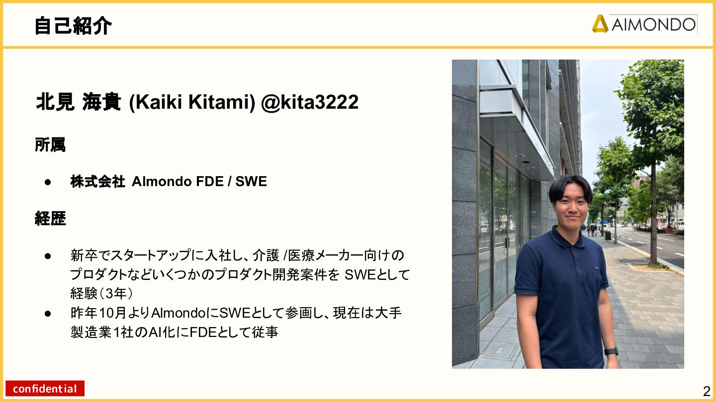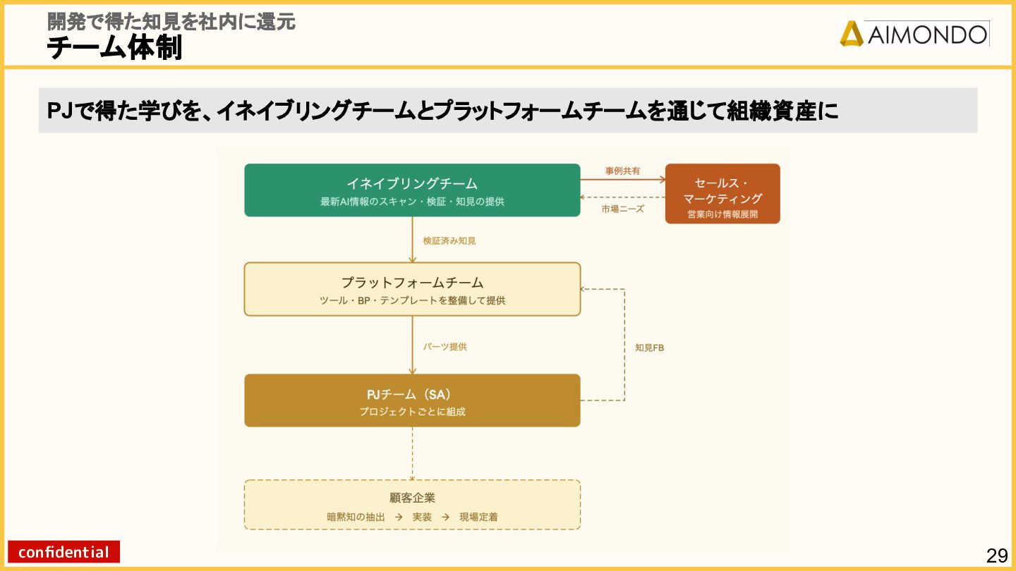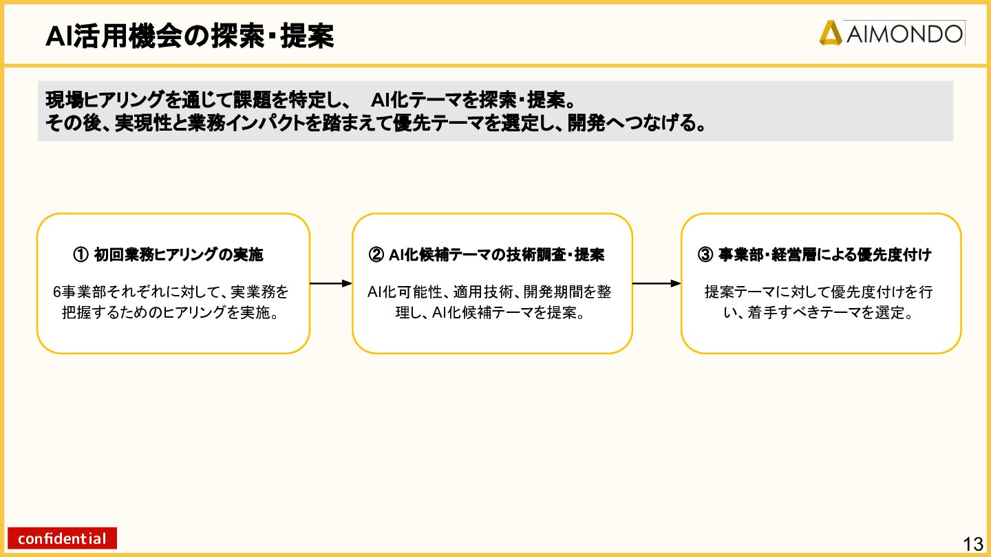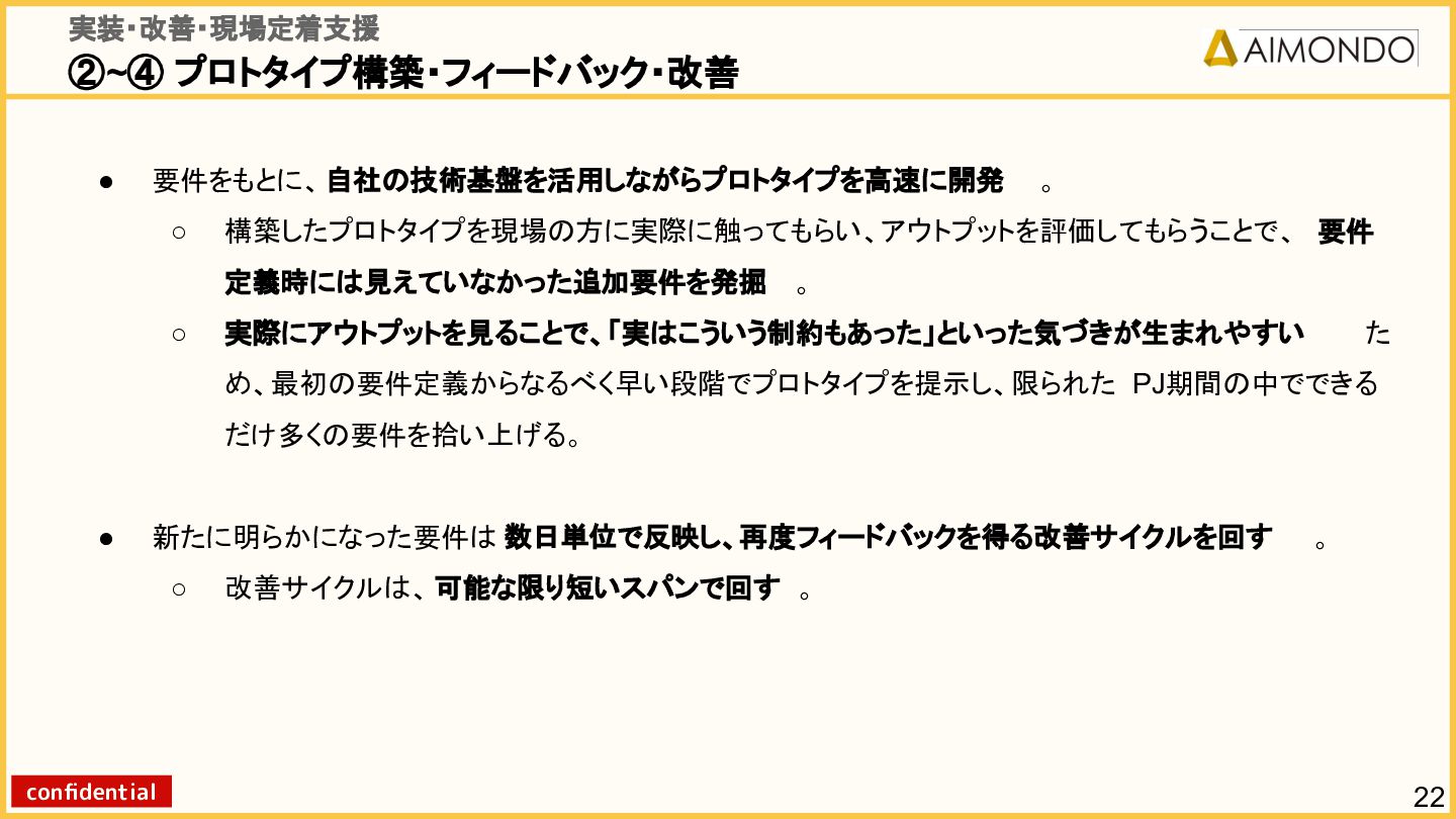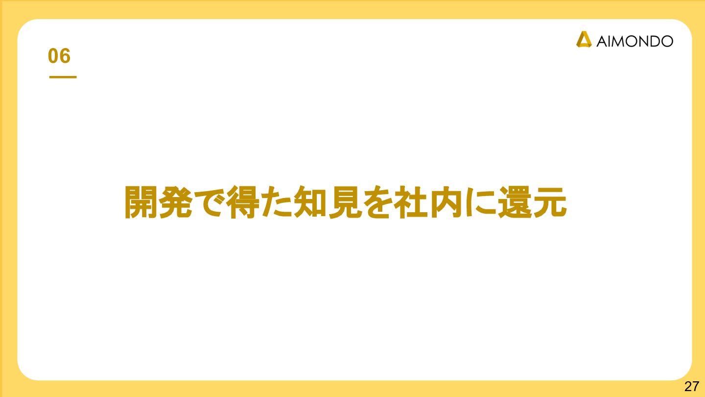 要件定義からモデル設計、システム連携、 運用保守までをワンストップで担い、 Biz・AI・SWが一体となったフルスタック 体制でスピードと品質を両立します。 PoCを週次単位で回し、本番導入まで最短距離 で到達する開発プロセスが強みです。 with AI-SI開発基盤の構築 従来型 SI の長期サイクルを前提から見直し、 “AI 時代に最適化された開発プロセス ” を ゼロから設計する挑戦です。 • テンダ社など SI パートナーで得た実務知見 をもとに、要件定義〜運用までを少数精鋭で 高速に回せる共通基盤を構築 • with AIを前提として工程ごとに検証しながら、 プロセス自体を段階的にブラッシュアップ 新規事業探索 「開発会社から企画会社へ 」 AIネイティブ前 提でビジネスモデルを再設計する複数のテー マを進行中です。 既存事業で蓄積した技術・データ・顧客接点を 活かし、Almondoならではの形で新たな価値 創造に挑戦します。 キーワード: データ基盤/リアルタイム音声解析 /ダイナミックプ ライシング/感情工学/芸術/etc
