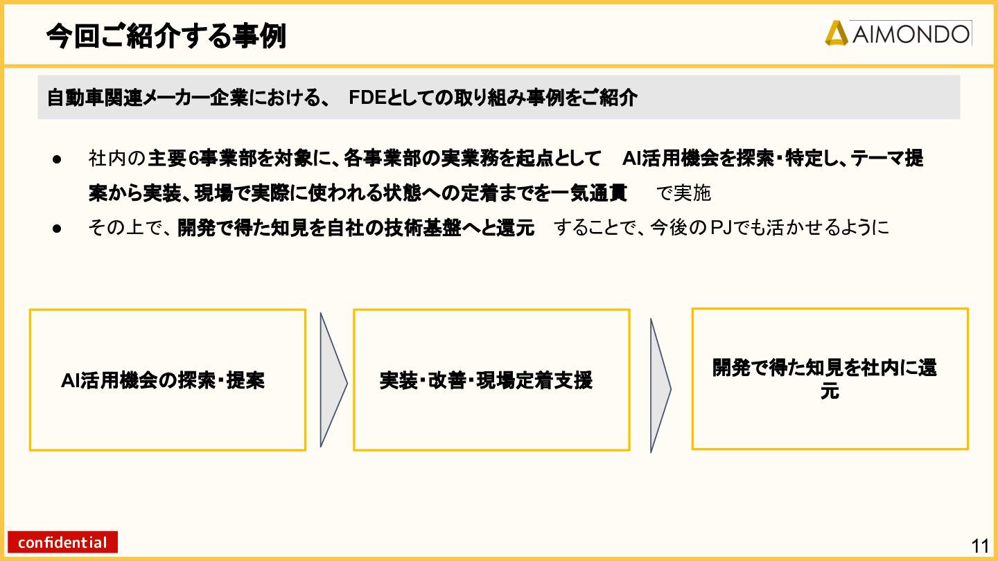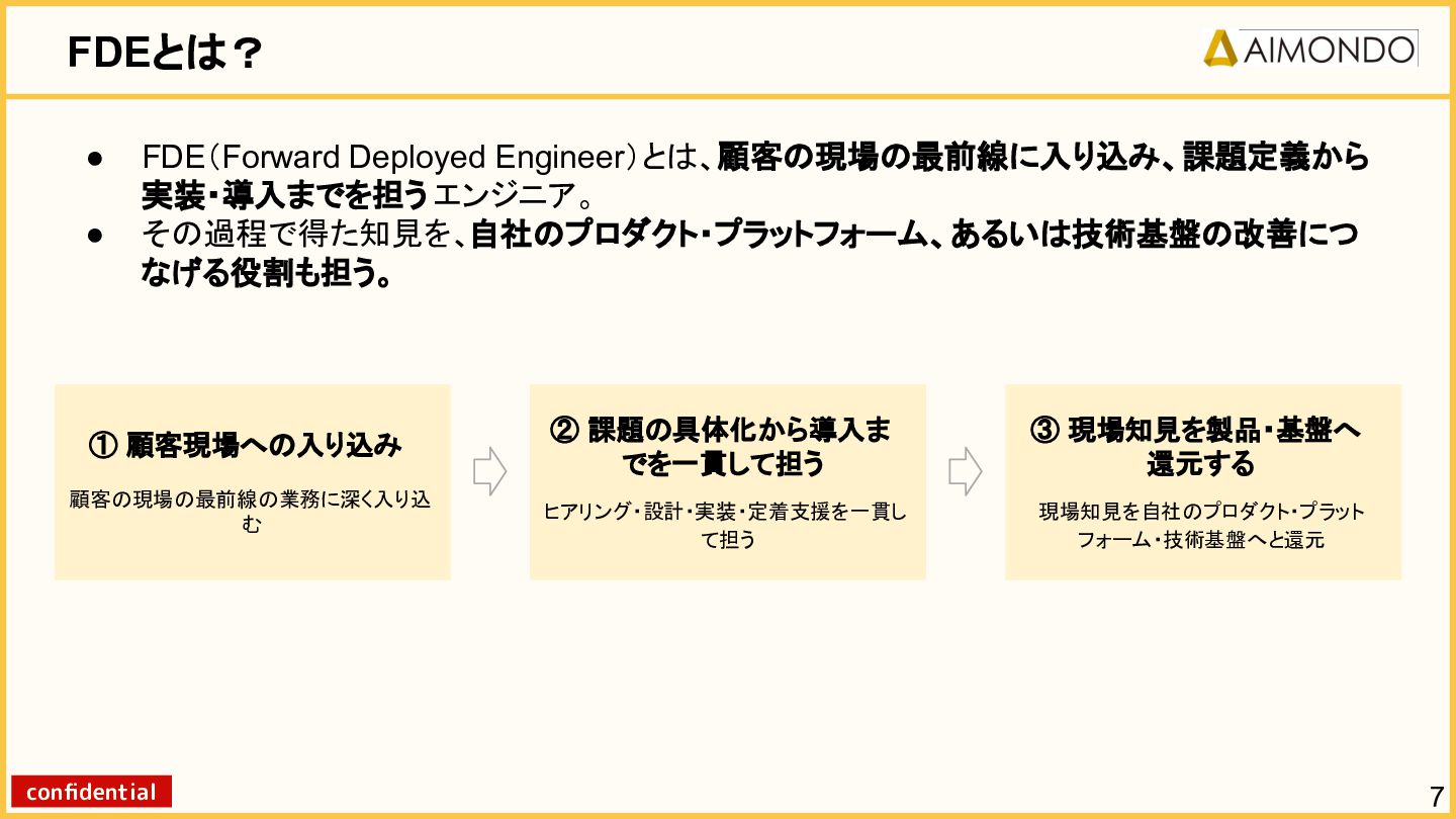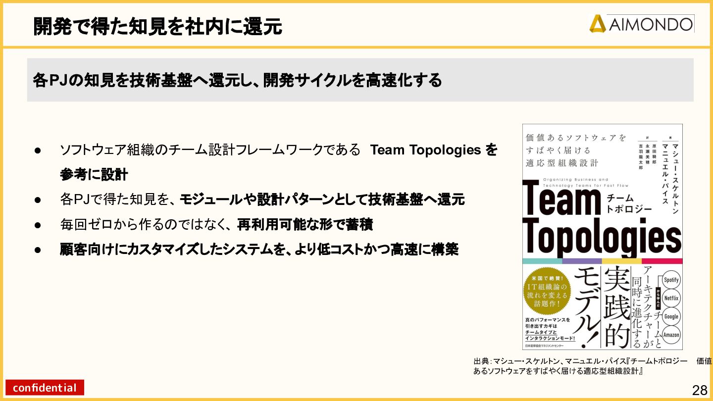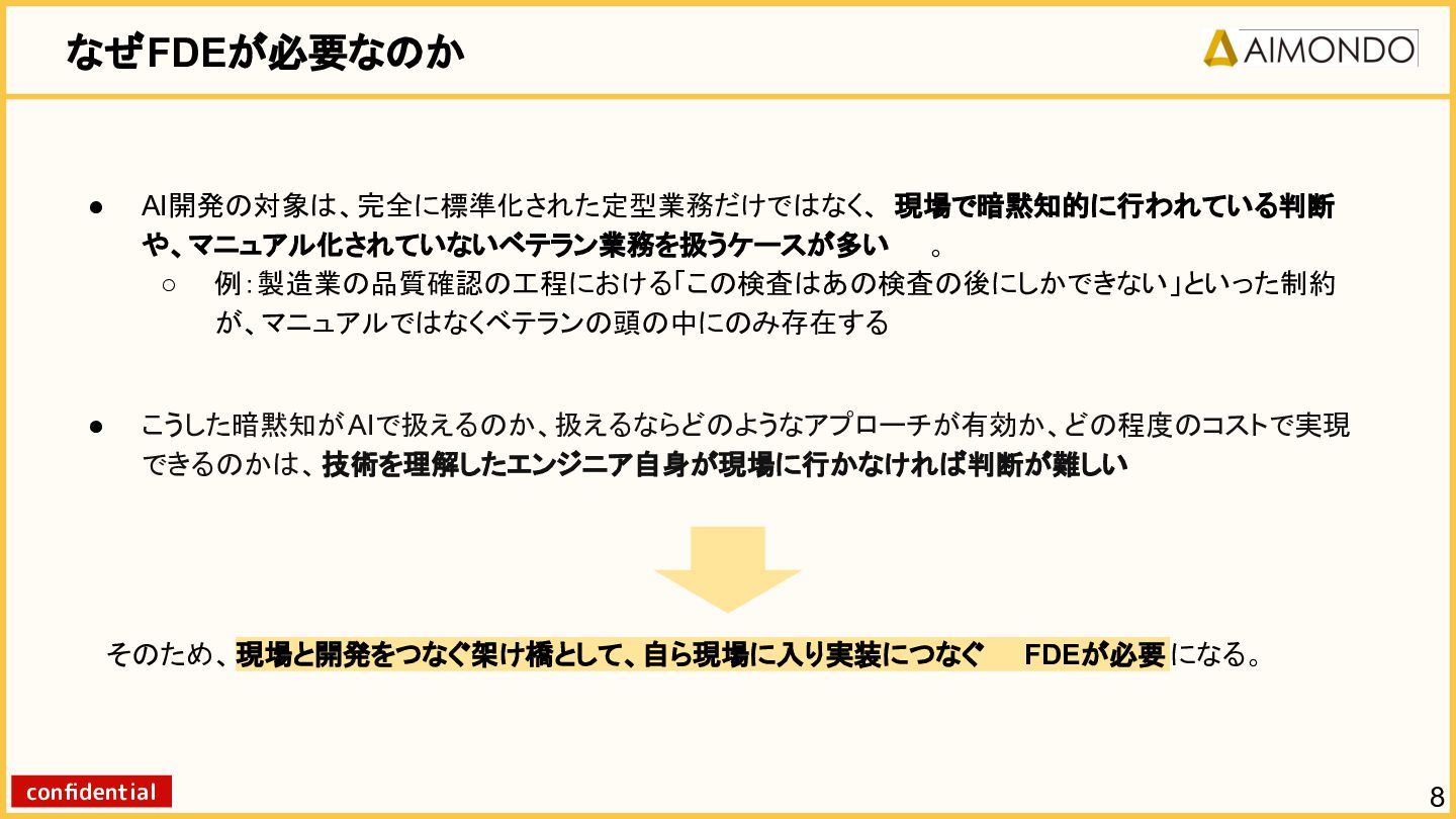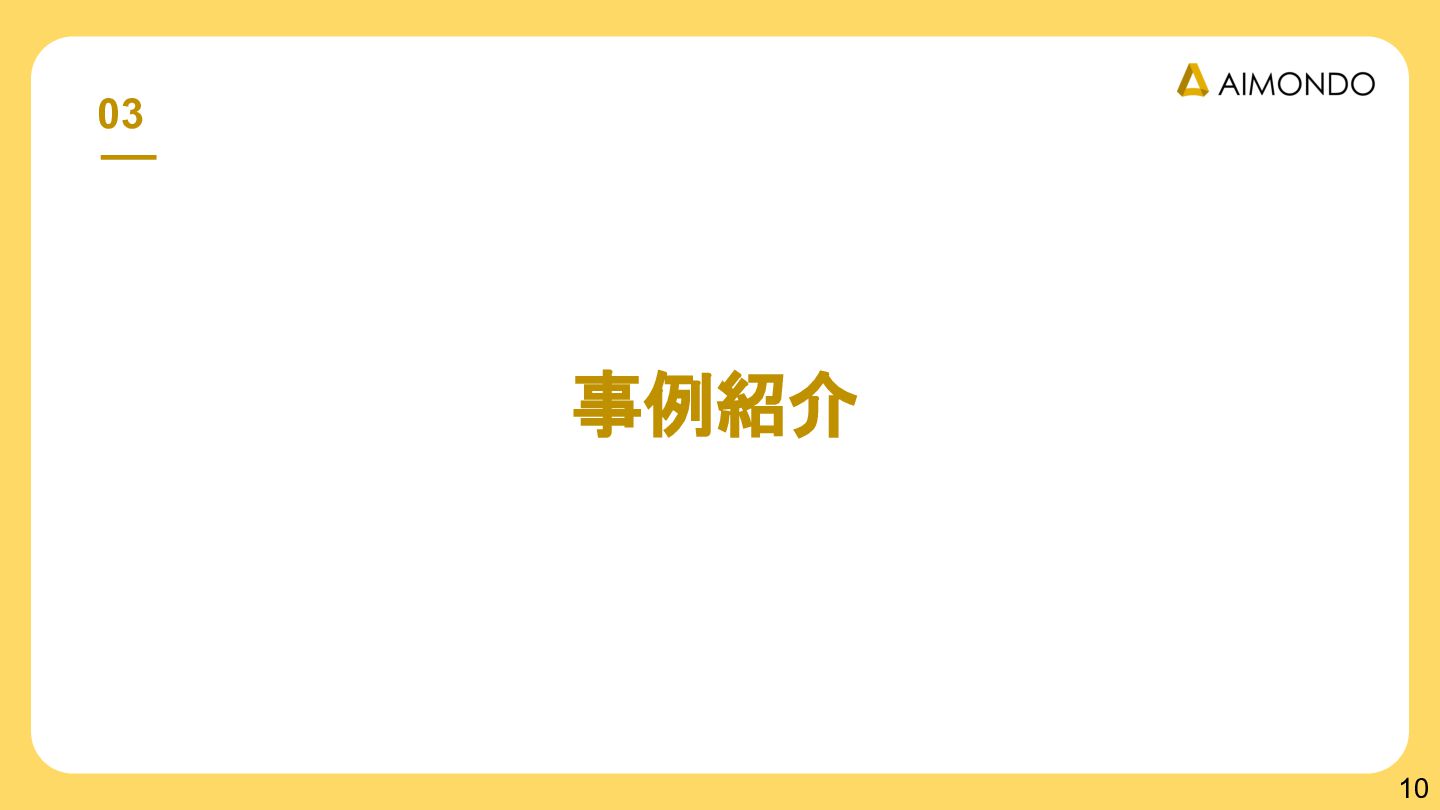 要件定義からモデル設計、システム連携、 運用保守までをワンストップで担い、 Biz・AI・SWが一体となったフルスタック 体制でスピードと品質を両立します。 PoCを週次単位で回し、本番導入まで最短距離 で到達する開発プロセスが強みです。 with AI-SI開発基盤の構築 従来型 SI の長期サイクルを前提から見直し、 “AI 時代に最適化された開発プロセス ” を ゼロから設計する挑戦です。 • テンダ社など SI パートナーで得た実務知見 をもとに、要件定義〜運用までを少数精鋭で 高速に回せる共通基盤を構築 • with AIを前提として工程ごとに検証しながら、 プロセス自体を段階的にブラッシュアップ 新規事業探索 「開発会社から企画会社へ 」 AIネイティブ前 提でビジネスモデルを再設計する複数のテー マを進行中です。 既存事業で蓄積した技術・データ・顧客接点を 活かし、Almondoならではの形で新たな価値 創造に挑戦します。 キーワード: データ基盤/リアルタイム音声解析 /ダイナミックプ ライシング/感情工学/芸術/etc