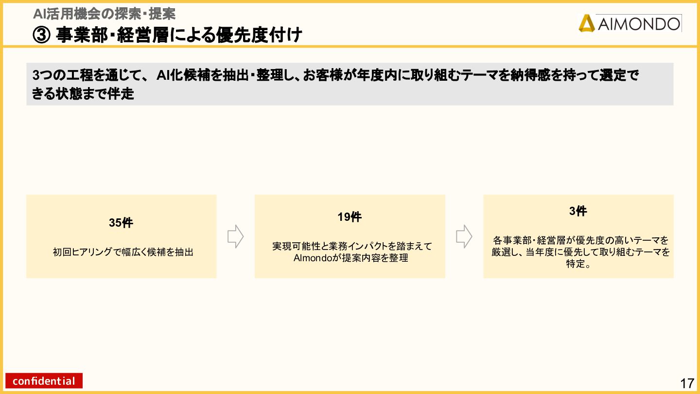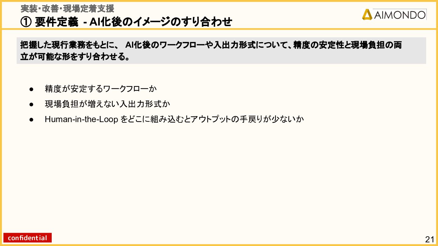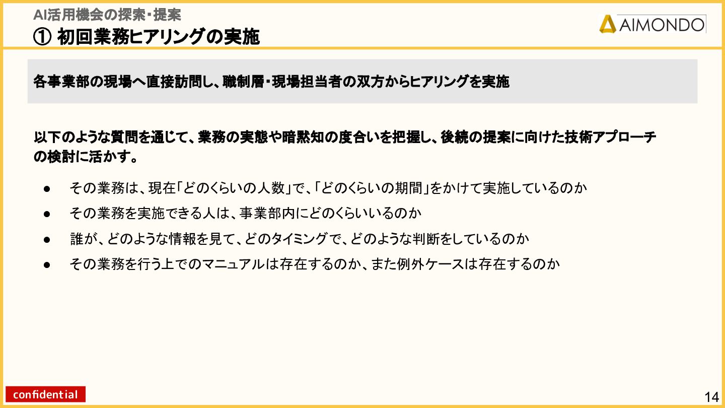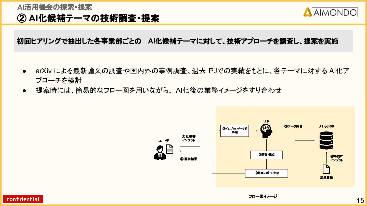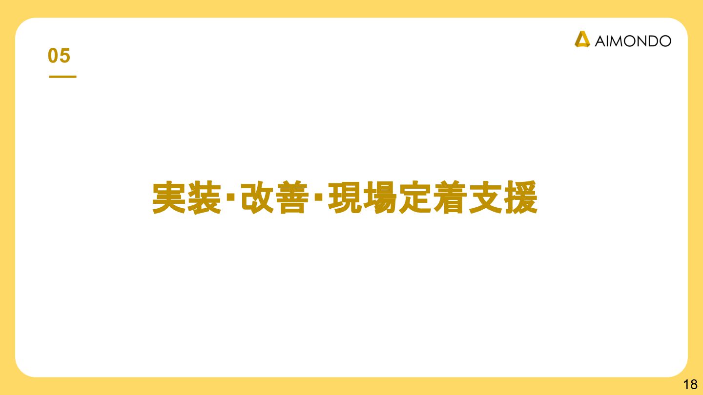 要件定義からモデル設計、システム連携、 運用保守までをワンストップで担い、 Biz・AI・SWが一体となったフルスタック 体制でスピードと品質を両立します。 PoCを週次単位で回し、本番導入まで最短距離 で到達する開発プロセスが強みです。 with AI-SI開発基盤の構築 従来型 SI の長期サイクルを前提から見直し、 “AI 時代に最適化された開発プロセス ” を ゼロから設計する挑戦です。 • テンダ社など SI パートナーで得た実務知見 をもとに、要件定義〜運用までを少数精鋭で 高速に回せる共通基盤を構築 • with AIを前提として工程ごとに検証しながら、 プロセス自体を段階的にブラッシュアップ 新規事業探索 「開発会社から企画会社へ 」 AIネイティブ前 提でビジネスモデルを再設計する複数のテー マを進行中です。 既存事業で蓄積した技術・データ・顧客接点を 活かし、Almondoならではの形で新たな価値 創造に挑戦します。 キーワード: データ基盤/リアルタイム音声解析 /ダイナミックプ ライシング/感情工学/芸術/etc