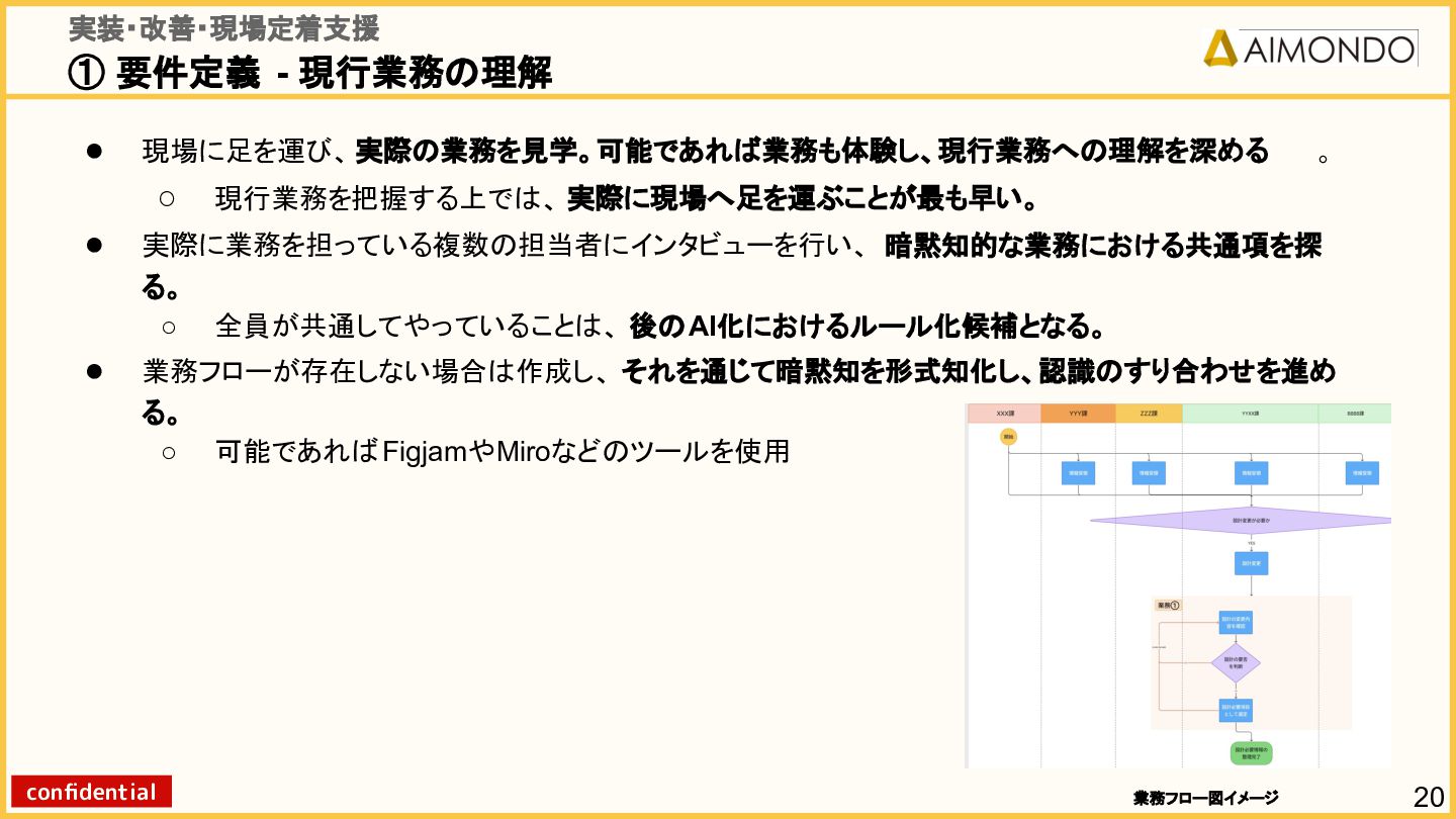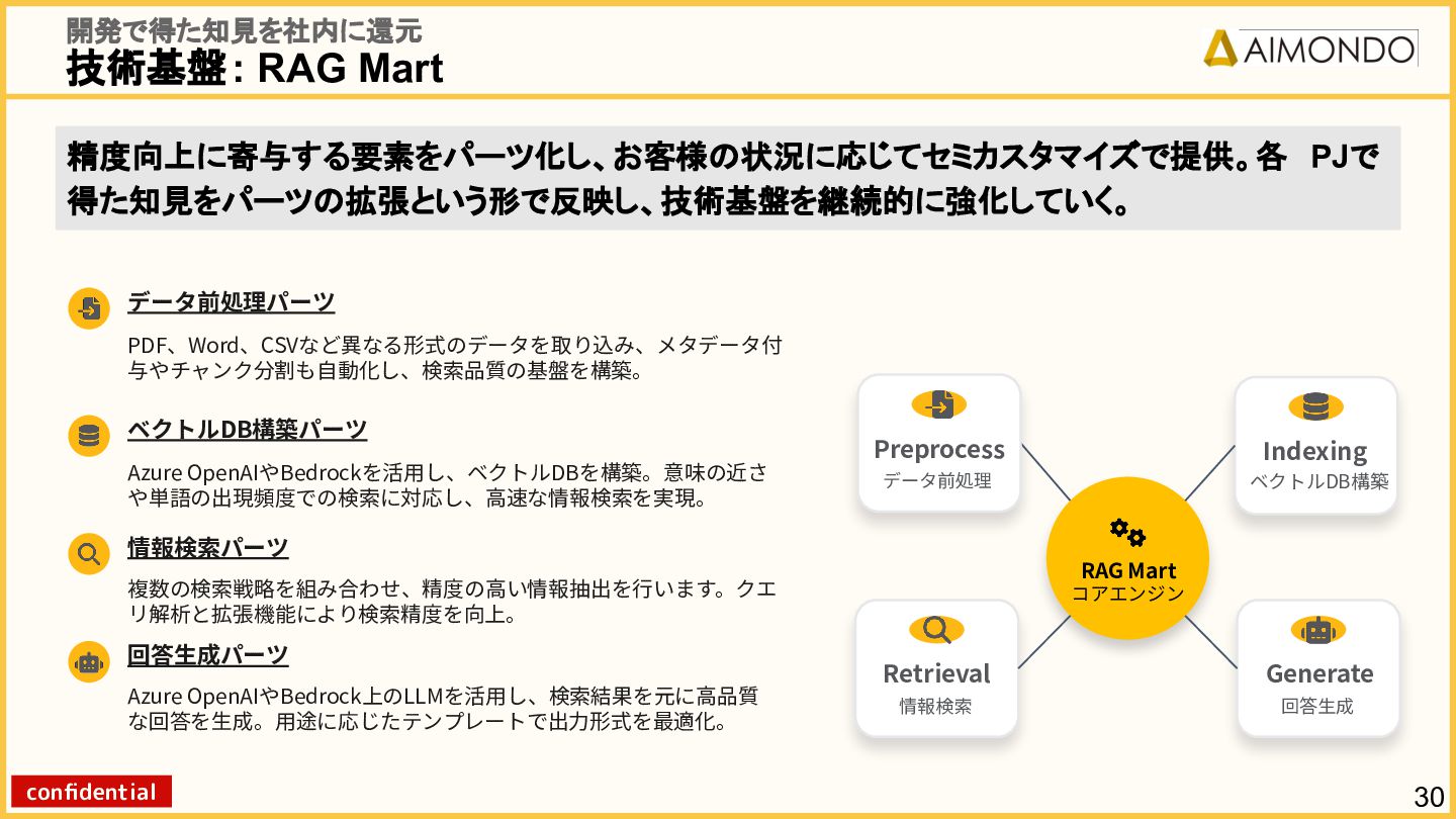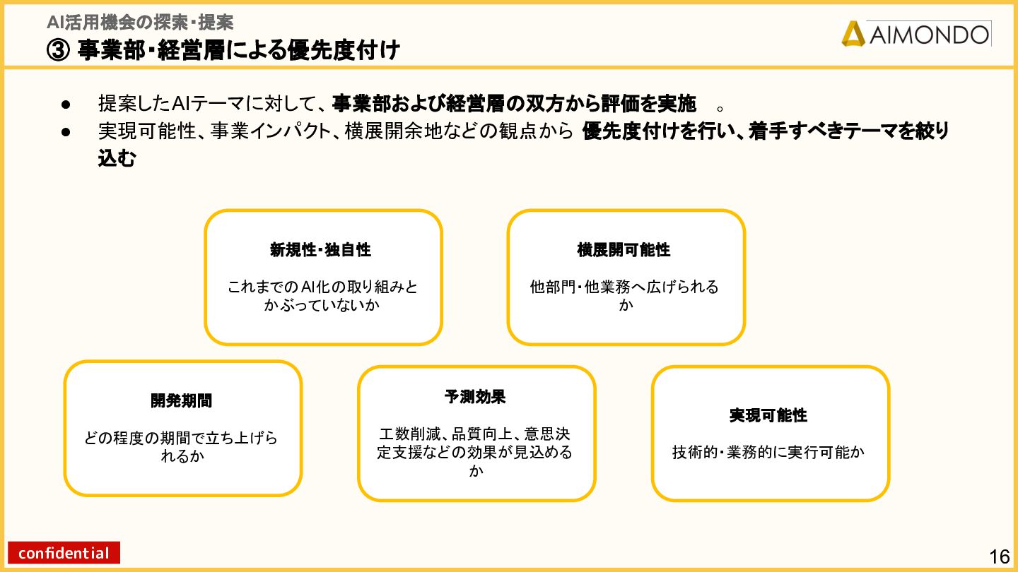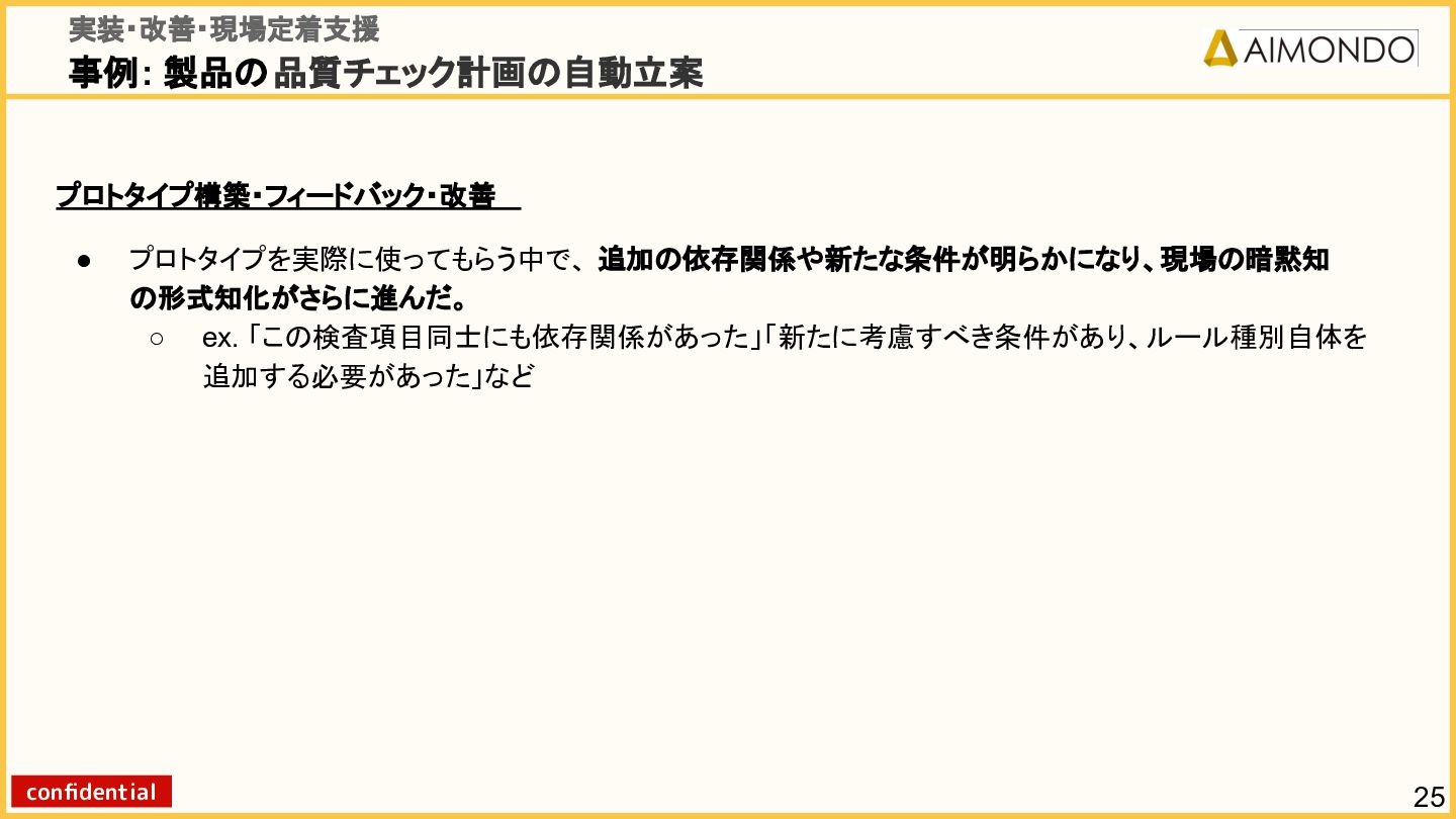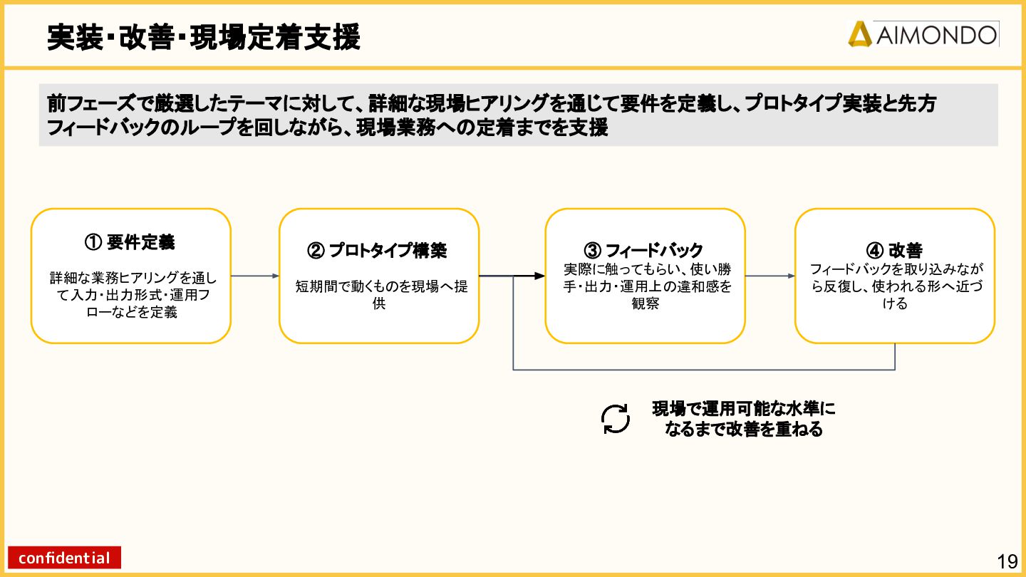 要件定義からモデル設計、システム連携、 運用保守までをワンストップで担い、 Biz・AI・SWが一体となったフルスタック 体制でスピードと品質を両立します。 PoCを週次単位で回し、本番導入まで最短距離 で到達する開発プロセスが強みです。 with AI-SI開発基盤の構築 従来型 SI の長期サイクルを前提から見直し、 “AI 時代に最適化された開発プロセス ” を ゼロから設計する挑戦です。 • テンダ社など SI パートナーで得た実務知見 をもとに、要件定義〜運用までを少数精鋭で 高速に回せる共通基盤を構築 • with AIを前提として工程ごとに検証しながら、 プロセス自体を段階的にブラッシュアップ 新規事業探索 「開発会社から企画会社へ 」 AIネイティブ前 提でビジネスモデルを再設計する複数のテー マを進行中です。 既存事業で蓄積した技術・データ・顧客接点を 活かし、Almondoならではの形で新たな価値 創造に挑戦します。 キーワード: データ基盤/リアルタイム音声解析 /ダイナミックプ ライシング/感情工学/芸術/etc