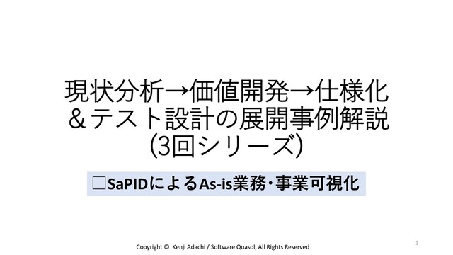 2021/12/9・15・21に開催した「現状分析→価値開発→仕様化&テスト設計の展開事例解説(3回シリーズ)」の1回目で解説した資料です。 →課題の把握とAs-Isの可視化<SaPID×RDRA>のうちSaPID部分 https://sapidcasestudy.connpass.com/event/229458/