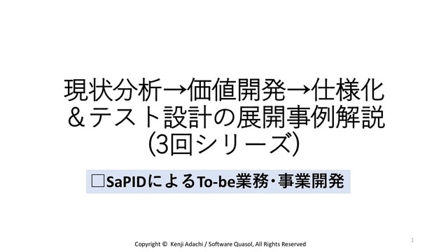 2021/12/9・15・21に開催した「現状分析→価値開発→仕様化&テスト設計の展開事例解説(3回シリーズ)」の2回目で解説した資料です。 →To-Beに向けた要求の整理と要件化<SaPID×RDRA>のうちSaPID部分 https://sapidcasestudy.connpass.com/event/229689/