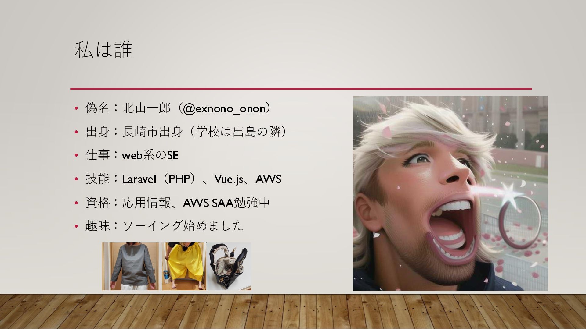私は誰 • 偽名:北山一郎(@exnono_onon) • 出身:長崎市出身(学校は出島の隣) • 仕事:web系のSE • 技能:Laravel(PHP)、Vue.js、AWS •