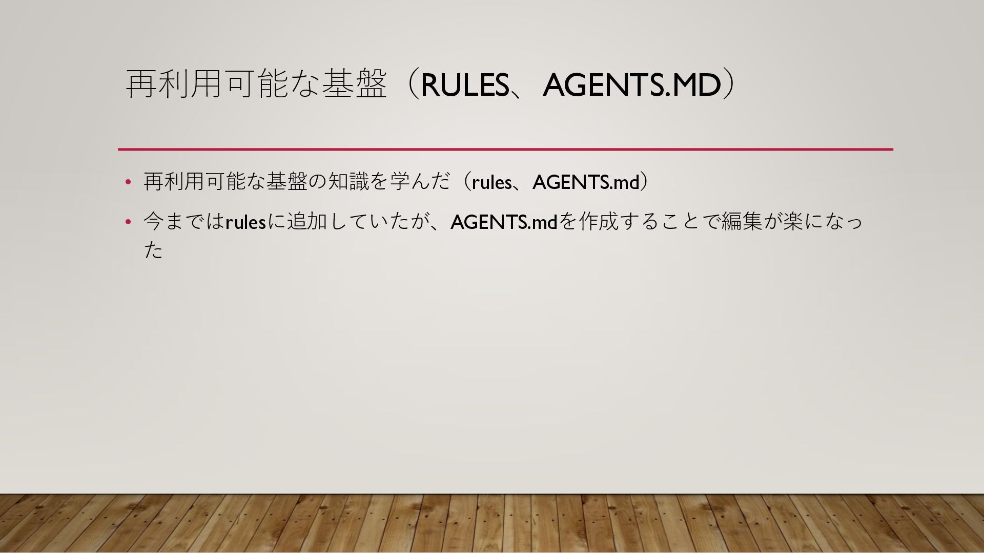 再利用可能な基盤(RULES、AGENTS.MD) • 再利用可能な基盤の知識を学んだ(rules、AGENTS.md) • 今まではrulesに追加していたが、AGENTS.mdを作成することで編集が楽になっ た