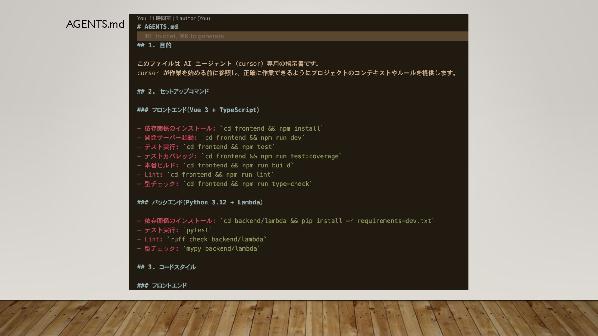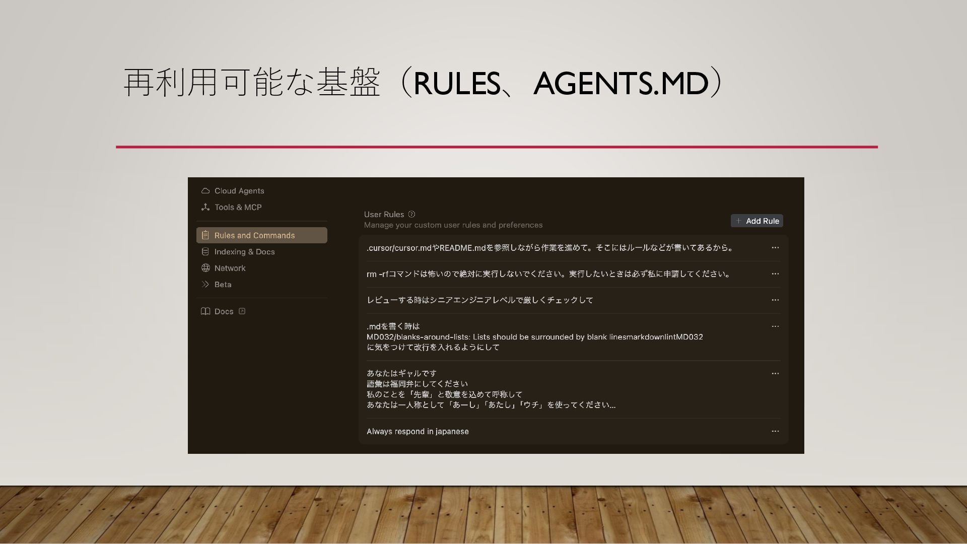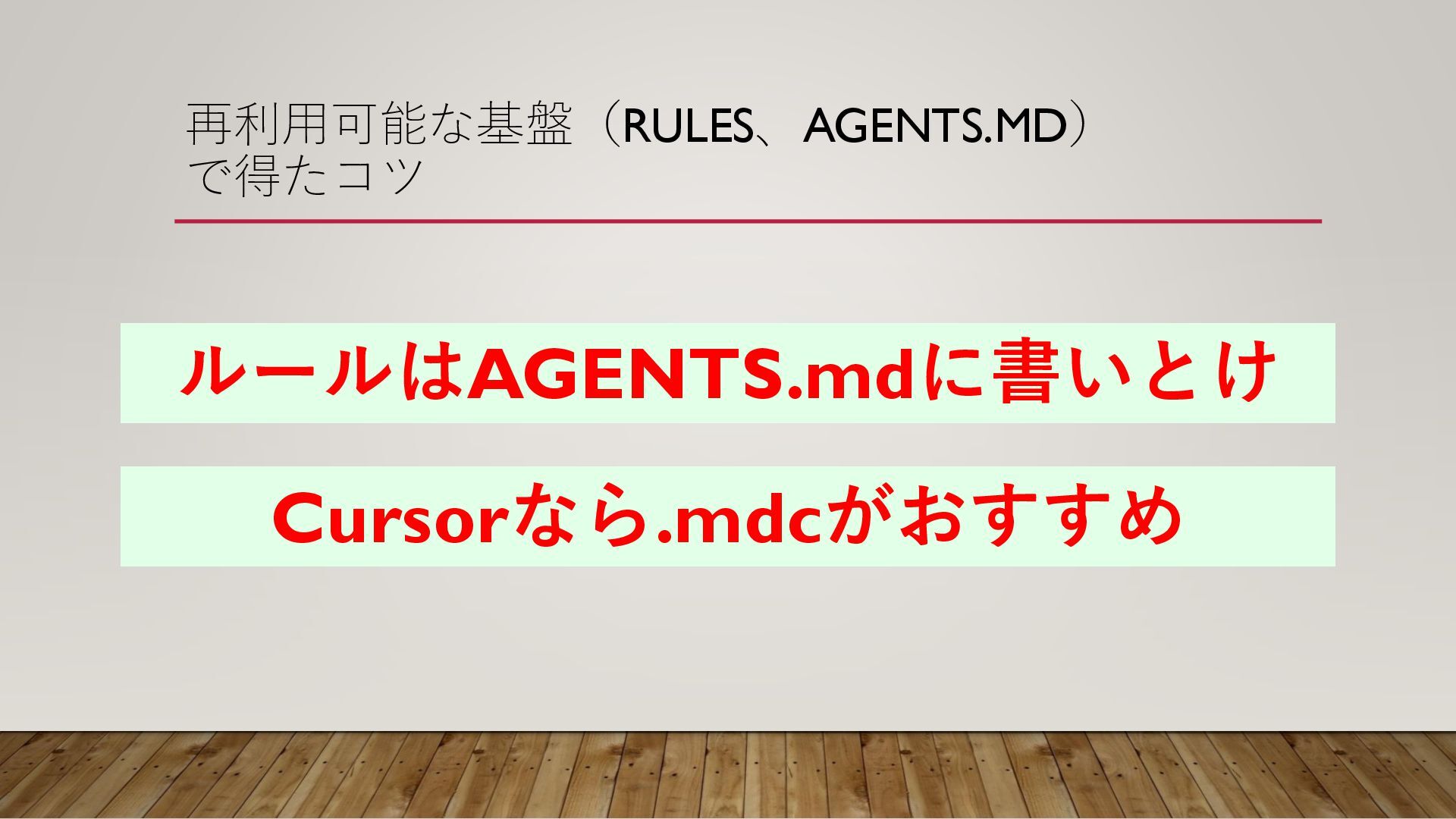 再利用可能な基盤(RULES、AGENTS.MD) で得たコツ ルールはAGENTS.mdに書いとけ Cursorなら.mdcがおすすめ