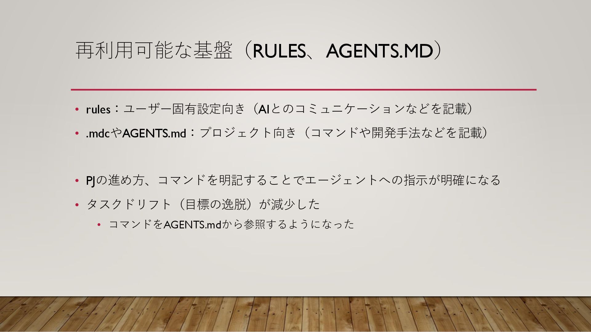 再利用可能な基盤(RULES、AGENTS.MD) • rules:ユーザー固有設定向き(AIとのコミュニケーションなどを記載) • .mdcやAGENTS.md:プロジェクト向き(コマンドや開発手法などを記載) • PJの進め方、コマンドを明記することでエージェントへの指示が明確になる • タスクドリフト(目標の逸脱)が減少した •