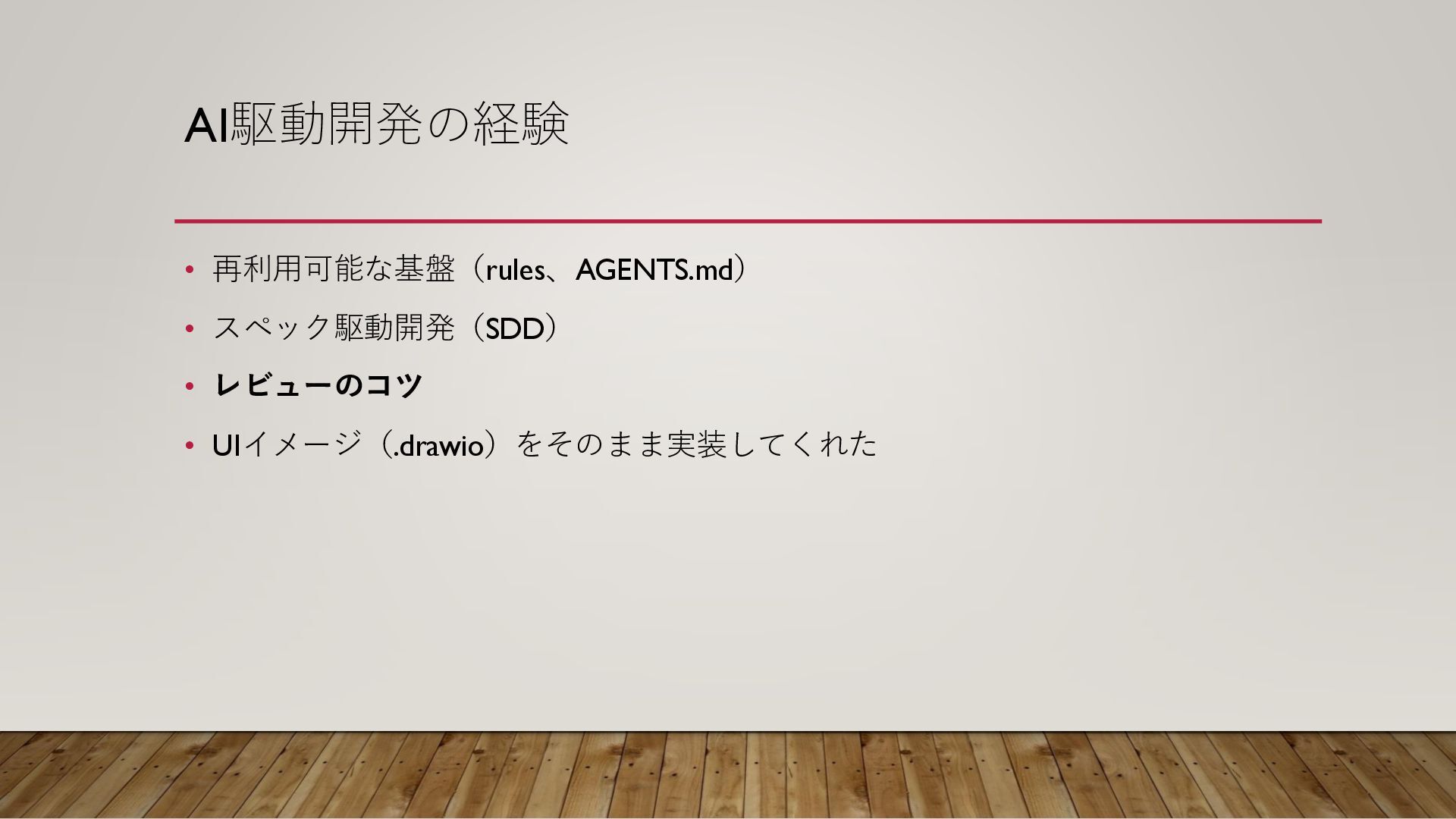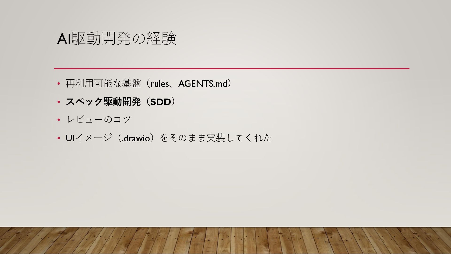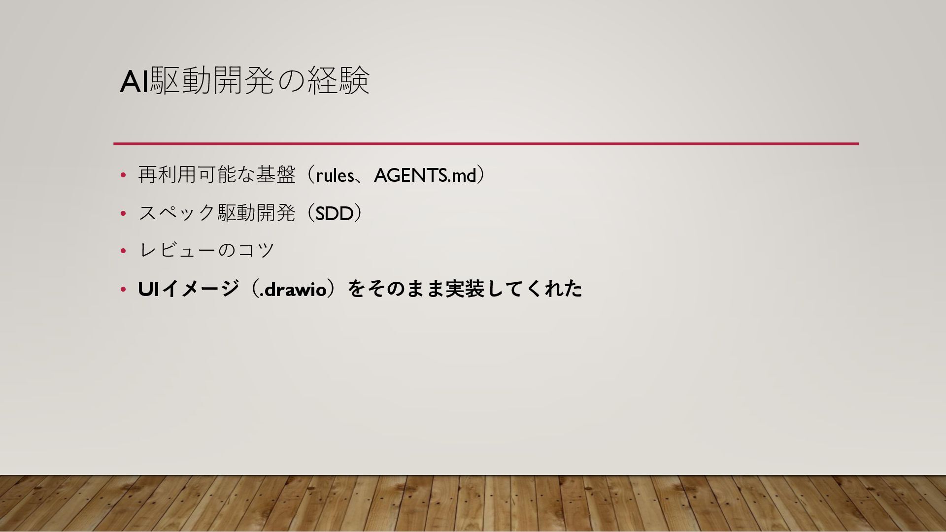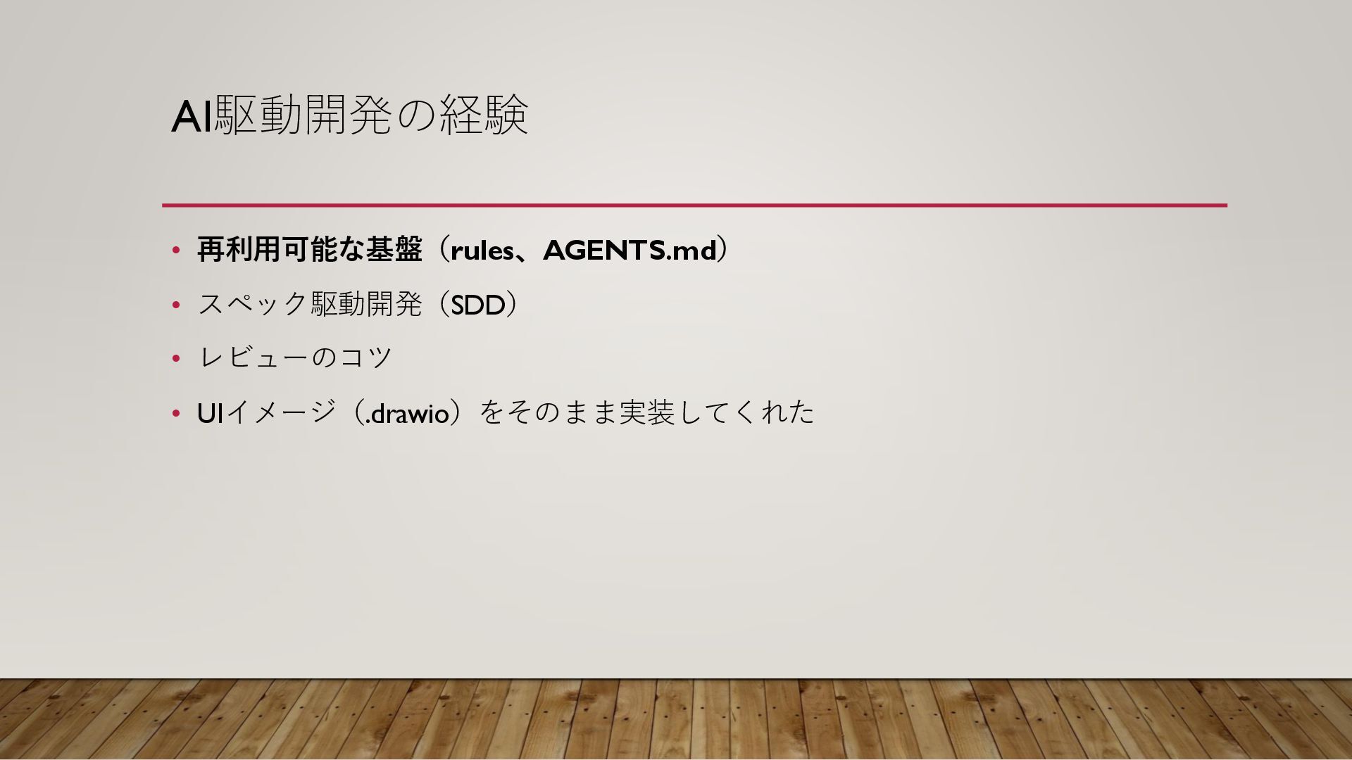 AI駆動開発の経験 • 再利用可能な基盤(rules、AGENTS.md) • スペック駆動開発(SDD) • レビューのコツ • UIイメージ(.drawio)をそのまま実装してくれた
