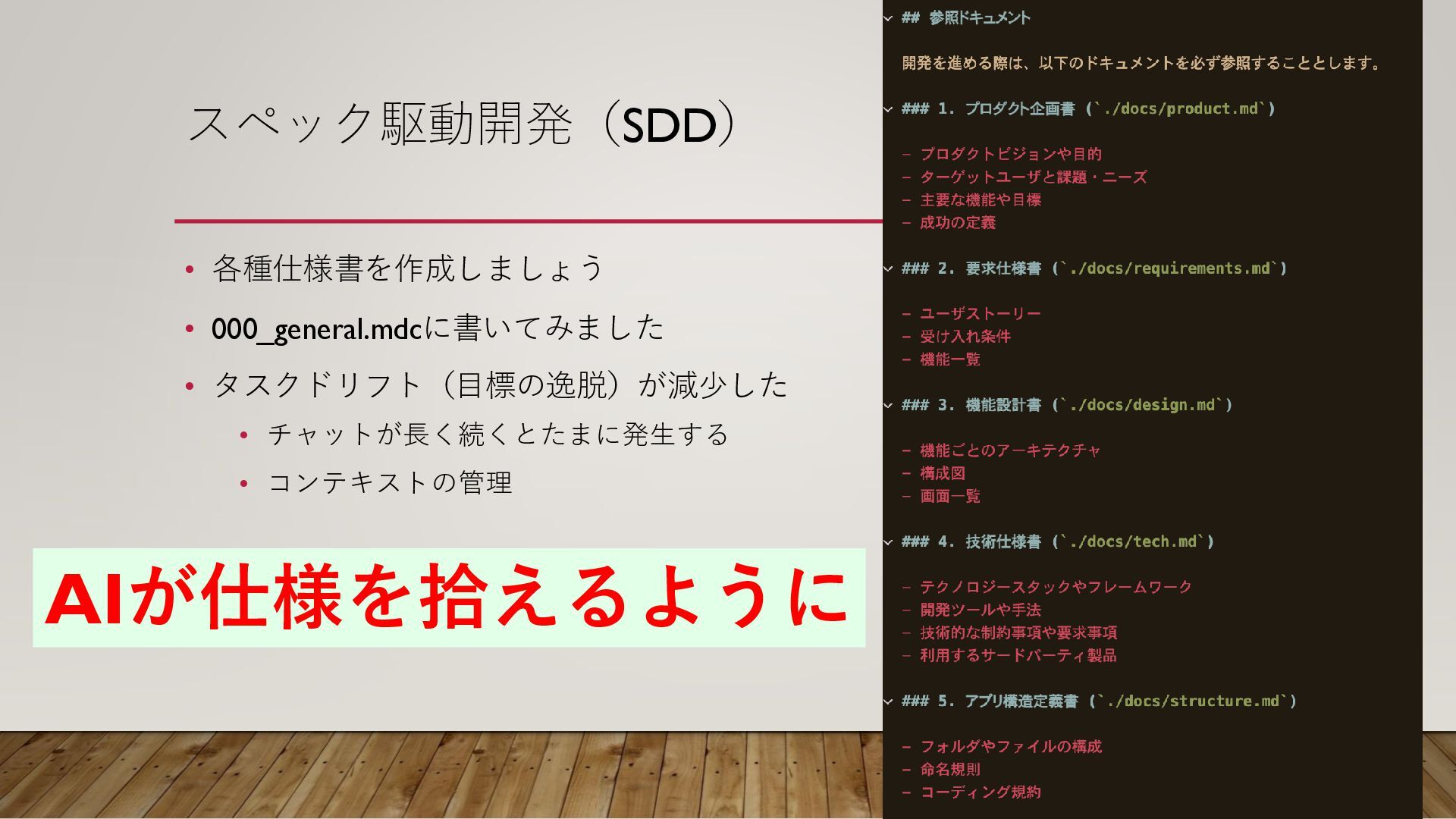 スペック駆動開発(SDD) • 各種仕様書を作成しましょう • 000_general.mdcに書いてみました • タスクドリフト(目標の逸脱)が減少した • チャットが長く続くとたまに発生する •