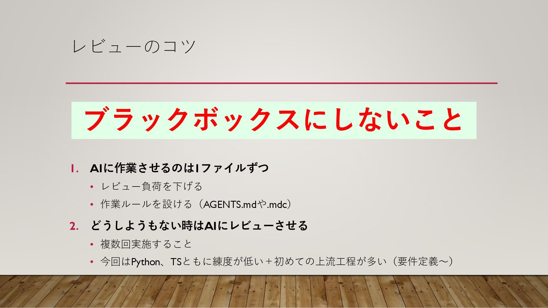 レビューのコツ 1. AIに作業させるのは1ファイルずつ • レビュー負荷を下げる • 作業ルールを設ける(AGENTS.mdや.mdc) 2. どうしようもない時はAIにレビューさせる •