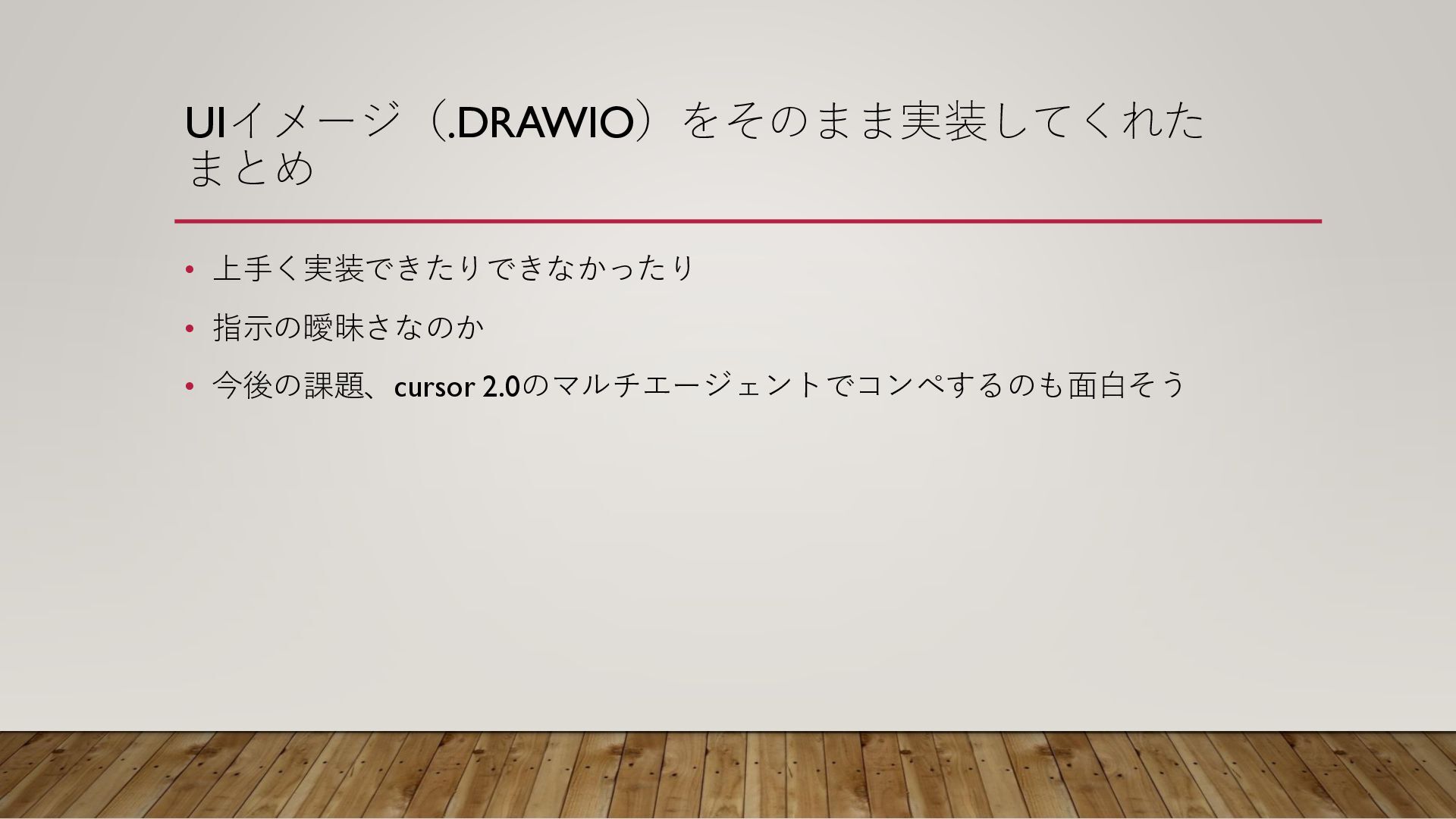 UIイメージ(.DRAWIO)をそのまま実装してくれた まとめ • 上手く実装できたりできなかったり • 指示の曖昧さなのか • 今後の課題、cursor 2.0のマルチエージェントでコンペするのも面白そう