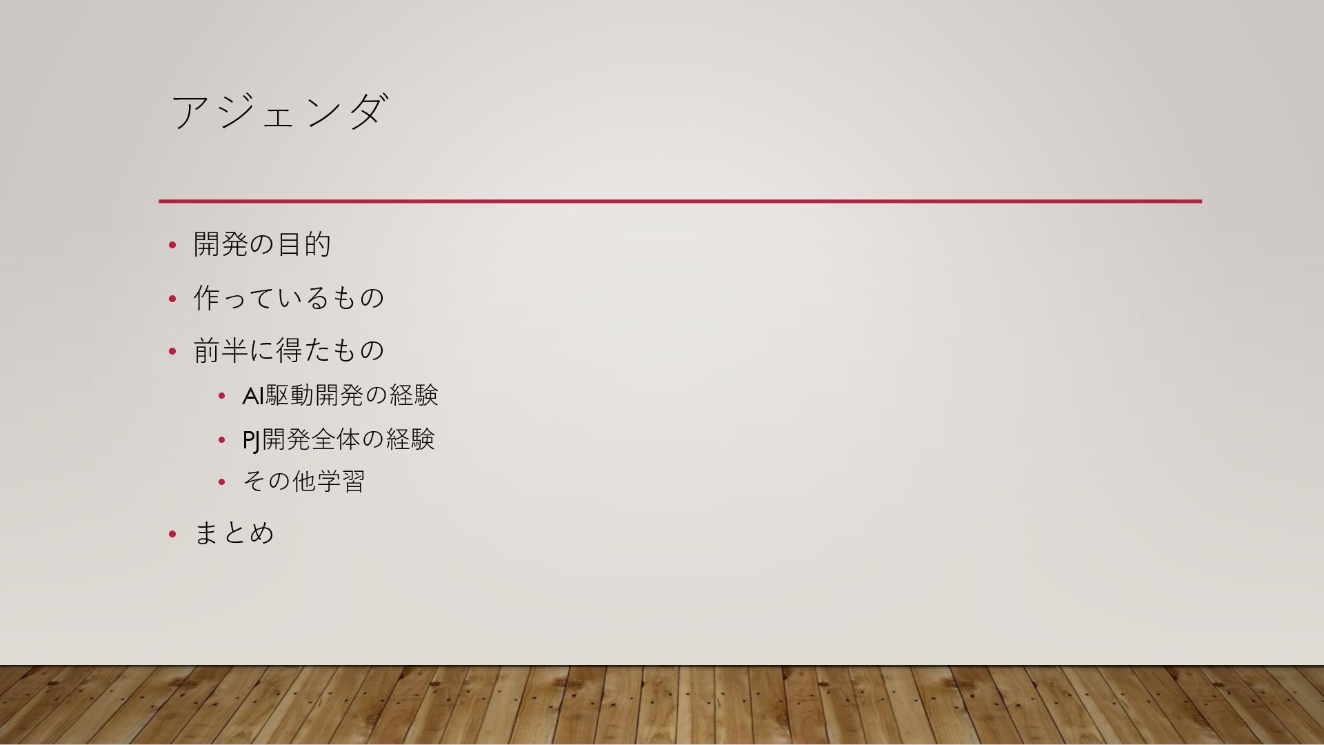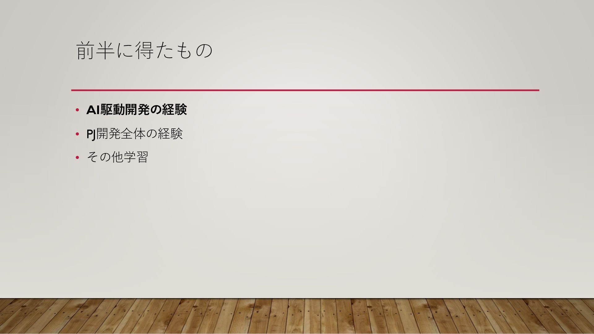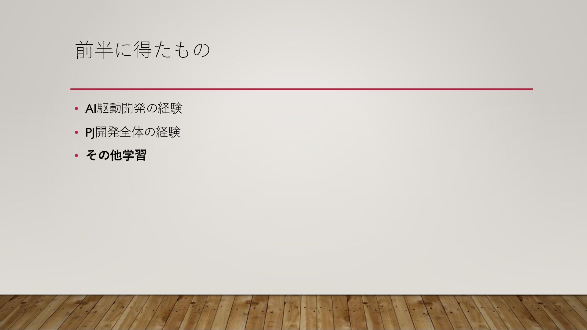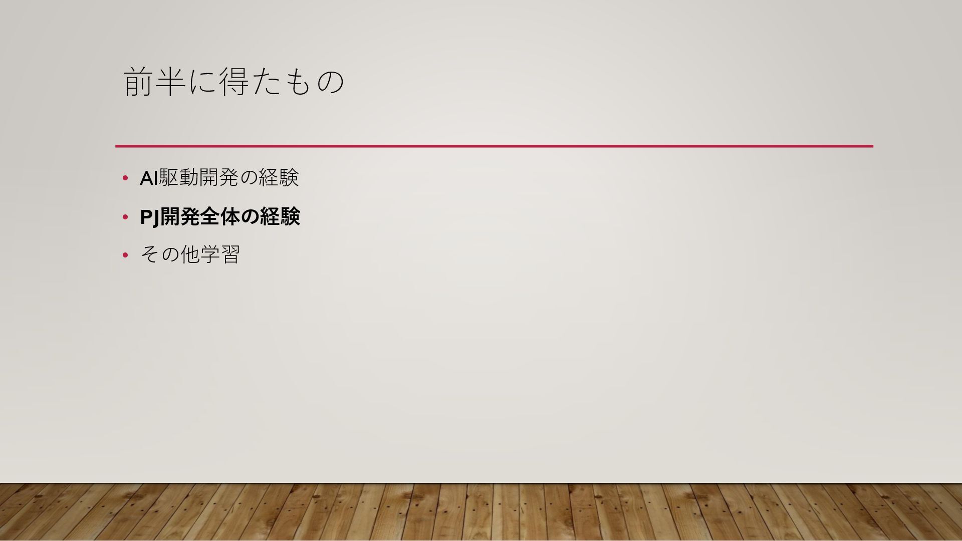 前半に得たもの • AI駆動開発の経験 • PJ開発全体の経験 • その他学習