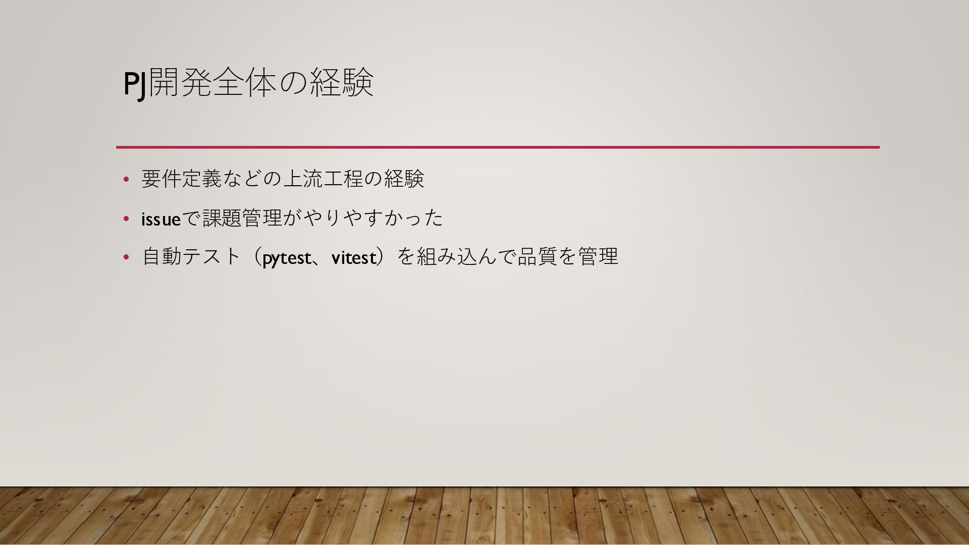 PJ開発全体の経験 • 要件定義などの上流工程の経験 • issueで課題管理がやりやすかった • 自動テスト(pytest、vitest)を組み込んで品質を管理