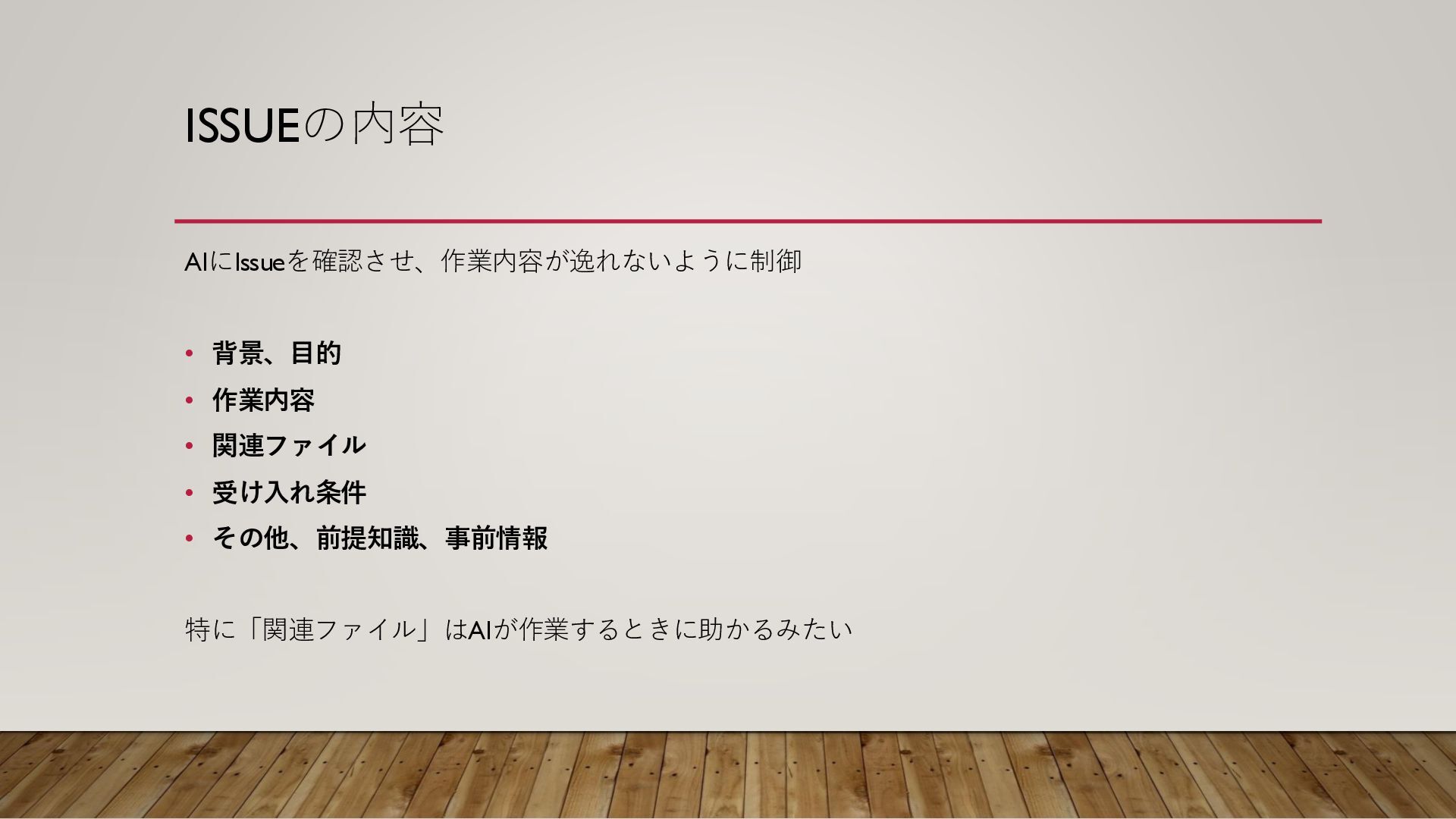 ISSUEの内容 AIにIssueを確認させ、作業内容が逸れないように制御 • 背景、目的 • 作業内容 • 関連ファイル • 受け入れ条件