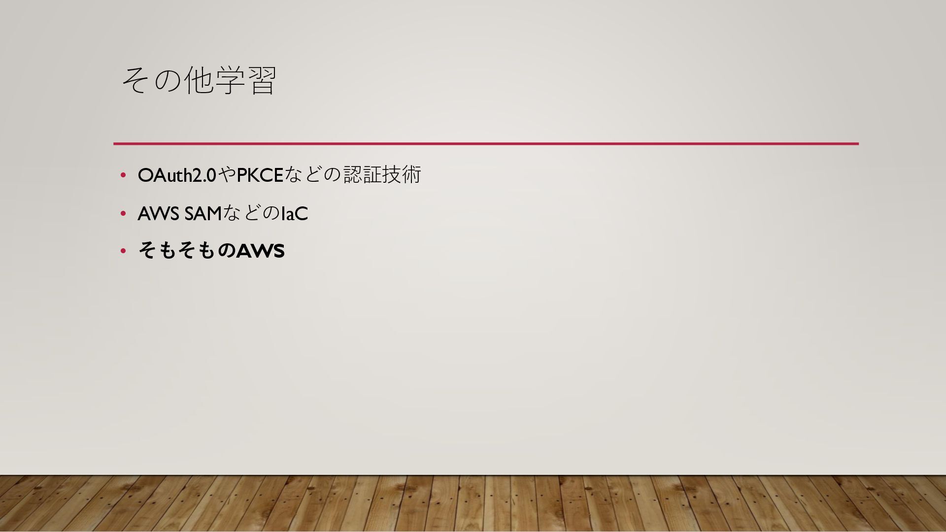 その他学習 • OAuth2.0やPKCEなどの認証技術 • AWS SAMなどのIaC • そもそものAWS