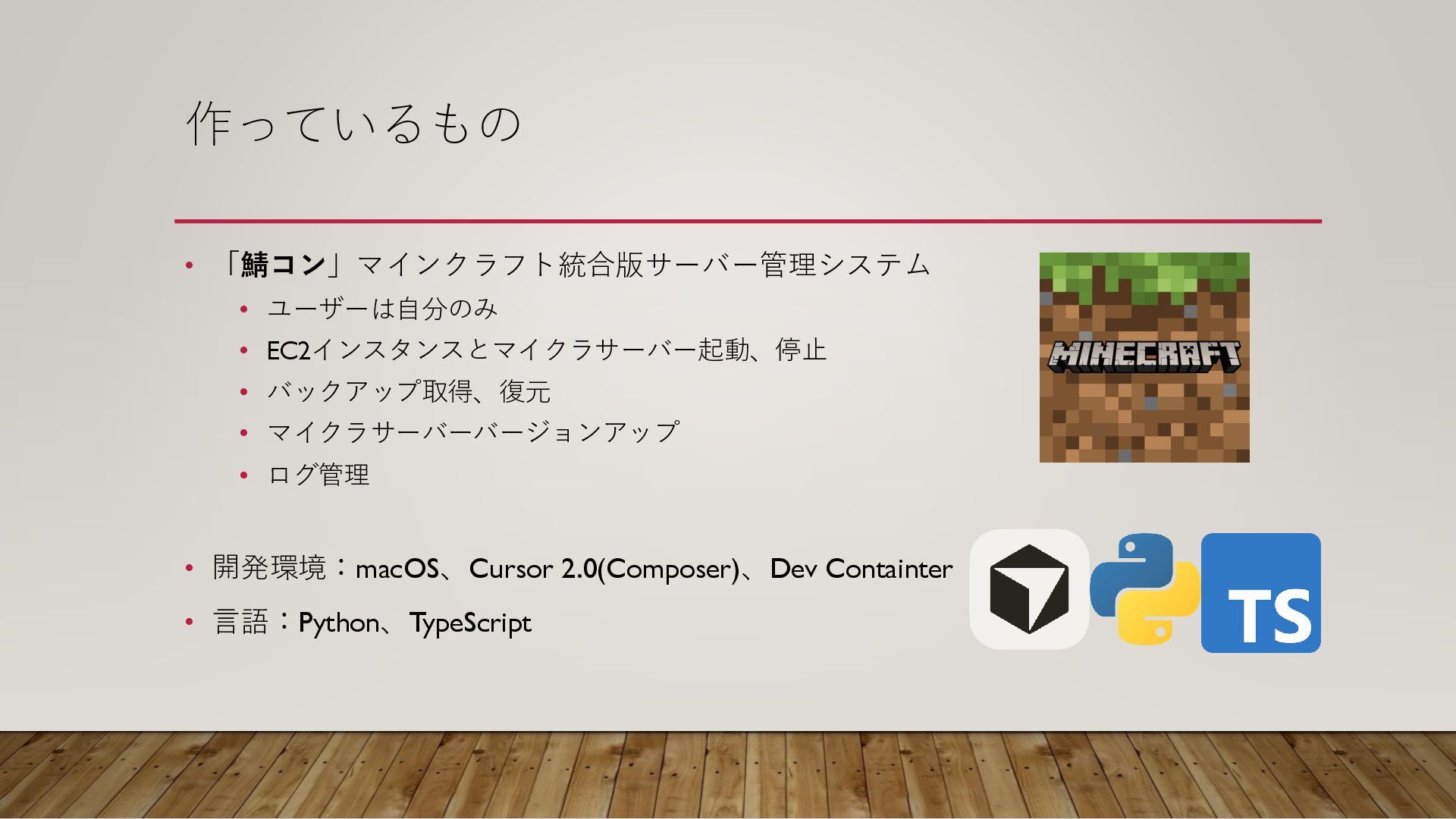 マイクラサーバーバージョンアップ • ログ管理 • 開発環境:macOS、Cursor 2.0(Composer)、Dev Containter • 言語:Python、TypeScript