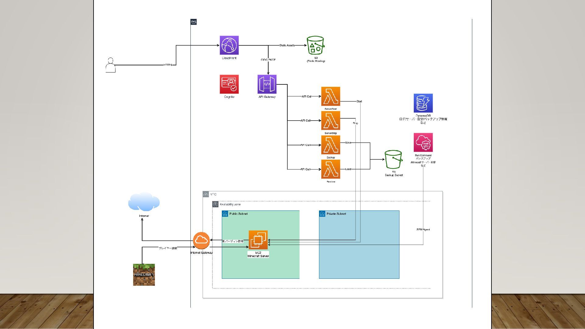 作っているもの • 「鯖コン」マインクラフト統合版サーバー管理システム • ユーザーは自分のみ • EC2インスタンスとマイクラサーバー起動、停止 • バックアップ取得、復元 •