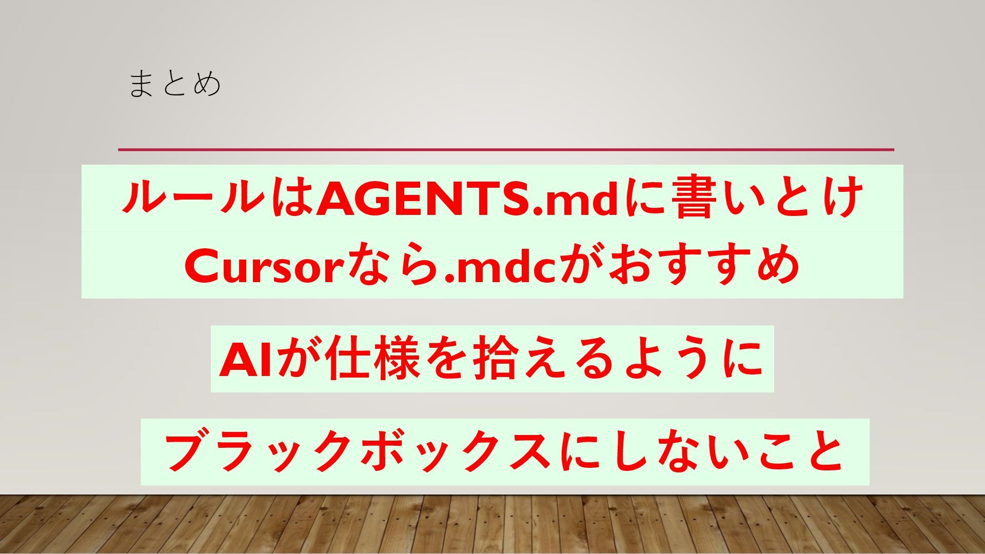 まとめ ルールはAGENTS.mdに書いとけ Cursorなら.mdcがおすすめ AIが仕様を拾えるように ブラックボックスにしないこと