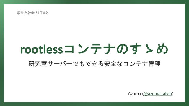 rootlessコンテナのすゝめ 研究室サーバーでもできる安全なコンテナ管理 Azuma (@azuma_alvin) 学生と社会人LT #2