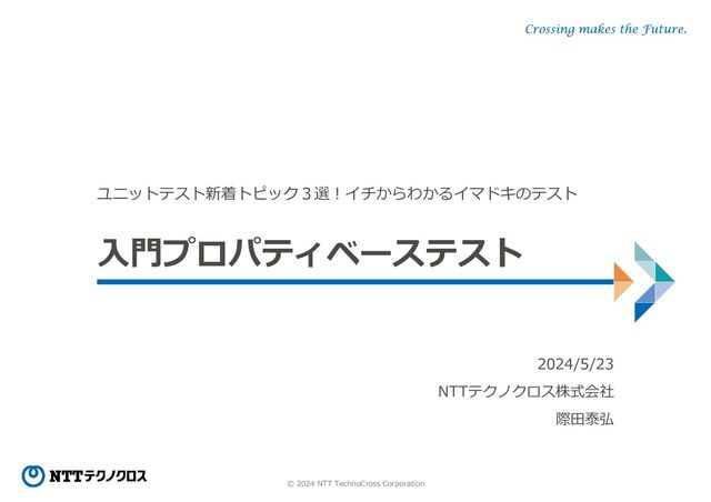 © 2024 NTT TechnoCross Corporation 入門プロパティベーステスト ユニットテスト新着トピック3選!イチからわかるイマドキのテスト 2024/5/23 NTTテクノクロス株式会社 際田泰弘