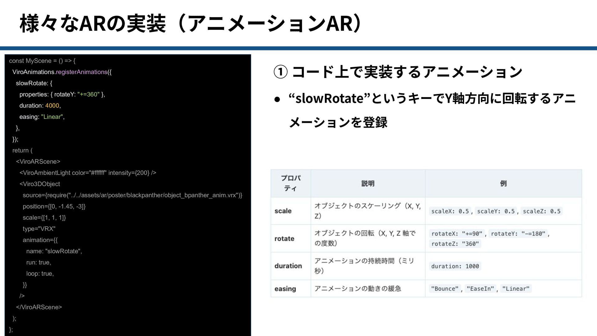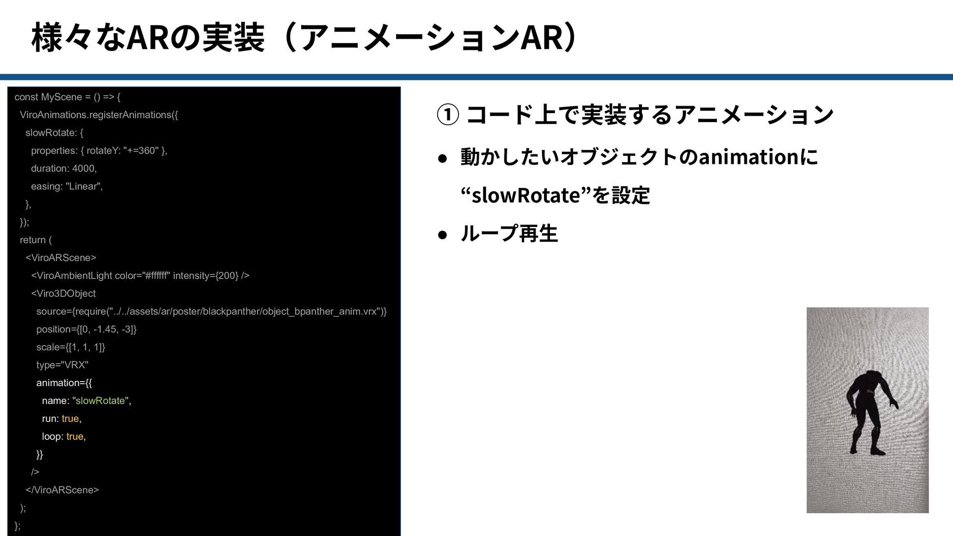 properties: { rotateY: "+=360" }, duration: 4000, easing: "Linear", }, }); return ( <ViroARScene> <ViroAmbientLight color="#ffffff" intensity={200} /> <Viro3DObject source={require("../../assets/ar/poster/blackpanther/object_bpanther_anim.vrx")} position={[0, -1.45, -3]} scale={[1, 1, 1]} type="VRX" animation={{ name: "slowRotate", run: true, loop: true, }} /> </ViroARScene> ); }; ① コード上で実装するアニメーション • 動かしたいオブジェクトのanimationに “slowRotate”を設定 • ループ再⽣