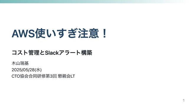 AWS使いすぎ注意! コスト管理とSlackアラート構築 木山瑞基 2025/05/28(水) CTO協会合同研修第3回 懇親会LT 1