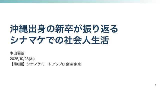 沖縄出身の新卒が振り返る シナマケでの社会人生活 木山瑞基 2025/10/23(木) 【第8回】シナマケミートアップLT会 in 東京 1