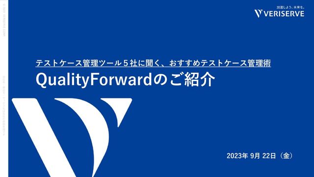 ビ ス 名 は 各 社 の 商 標 登 録 で す ©︎ 2023 VERISERVE CORP . QualityForwardのご紹介 テストケース管理ツール5社に聞く、おすすめテストケース管理術 2023年 9月 22日(金)