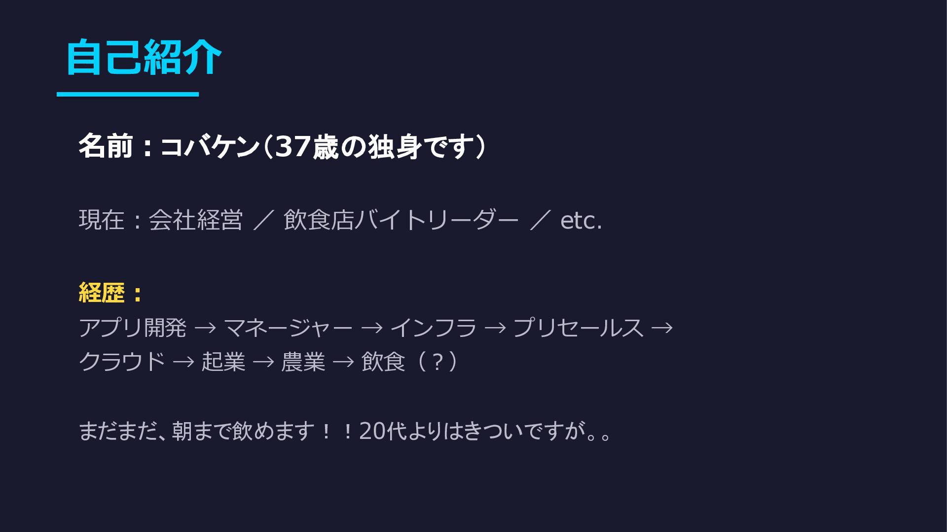 自己紹介 名前:コバケン(37歳の独身です) 現在:会社経営 / 飲食店バイトリーダー / etc. 経歴: アプリ開発 →