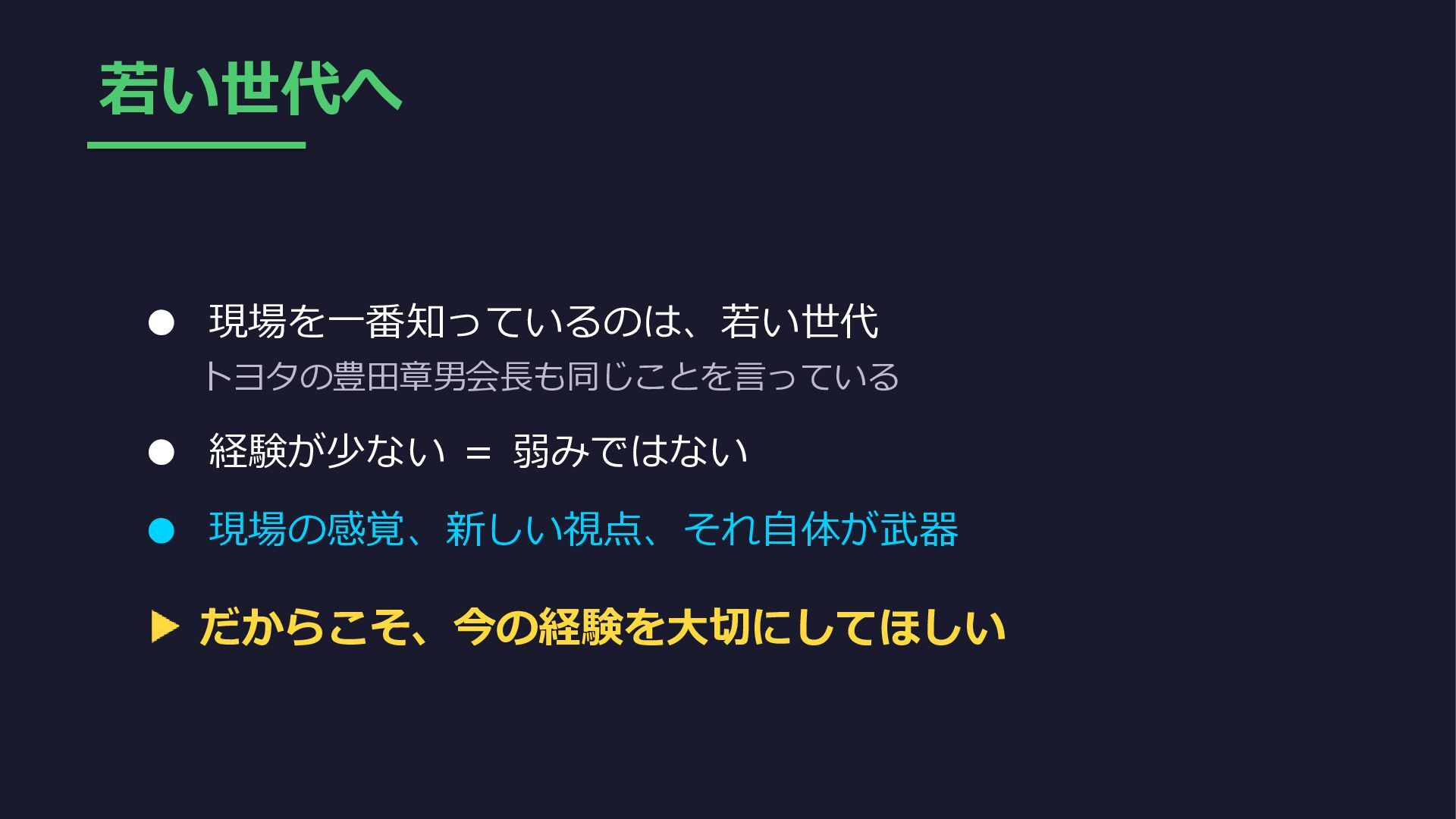 若い世代へ • 現場を一番知っているのは、若い世代 トヨタの豊田章男会長も同じことを言っている • 経験が少ない = 弱みではない • 現場の感覚、新しい視点、それ自体が武器
