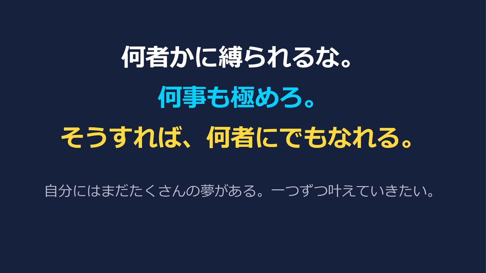 何者かに縛られるな。 何事も極めろ。 そうすれば、何者にでもなれる。 自分にはまだたくさんの夢がある。一つずつ叶えていきたい。