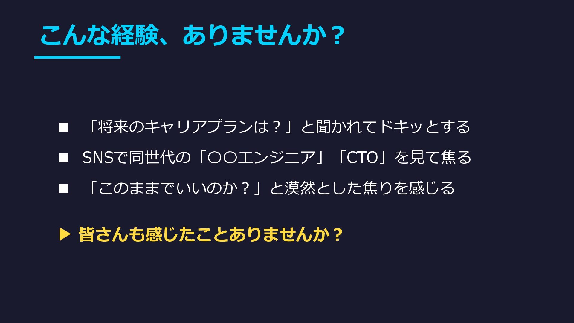 こんな経験、ありませんか? ▪ 「将来のキャリアプランは?」と聞かれてドキッとする ▪ SNSで同世代の「〇〇エンジニア」「CTO」を見て焦る ▪ 「このままでいいのか?」と漠然とした焦りを感じる 皆さんも感じたことありませんか?