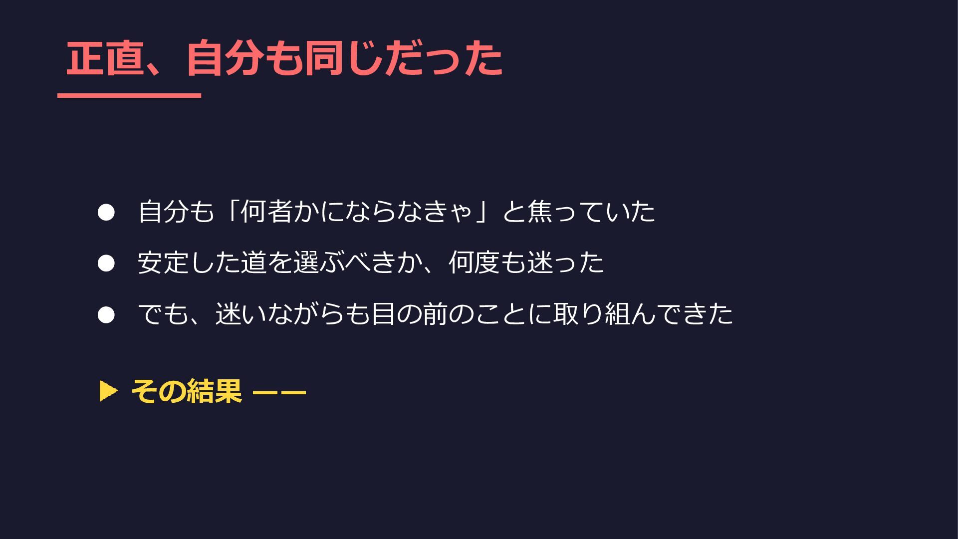 正直、自分も同じだった • 自分も「何者かにならなきゃ」と焦っていた • 安定した道を選ぶべきか、何度も迷った • でも、迷いながらも目の前のことに取り組んできた その結果 ——