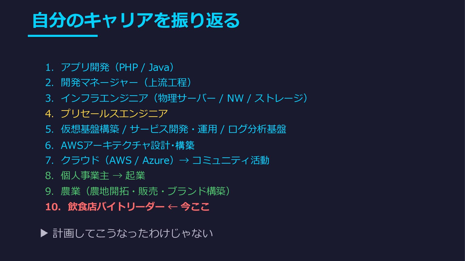 NW / ストレージ) 4. プリセールスエンジニア 5. 仮想基盤構築 / サービス開発・運用 / ログ分析基盤 6. AWSアーキテクチャ設計・構築 7. クラウド(AWS / Azure)→ コミュニティ活動 8. 個人事業主 → 起業 9. 農業(農地開拓・販売・ブランド構築) 10. 飲食店バイトリーダー ← 今ここ 計画してこうなったわけじゃない