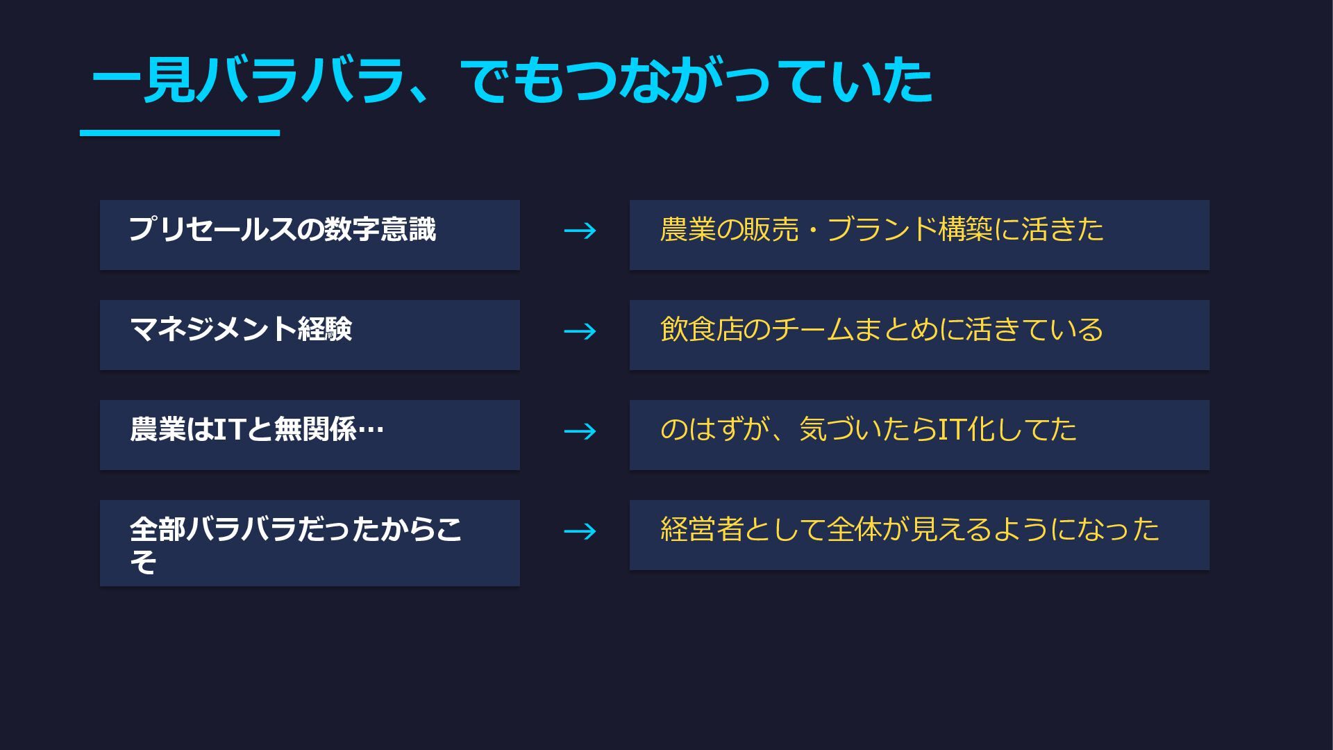 一見バラバラ、でもつながっていた プリセールスの数字意識 → 農業の販売・ブランド構築に活きた マネジメント経験 → 飲食店のチームまとめに活きている 農業はITと無関係… → のはずが、気づいたらIT化してた
