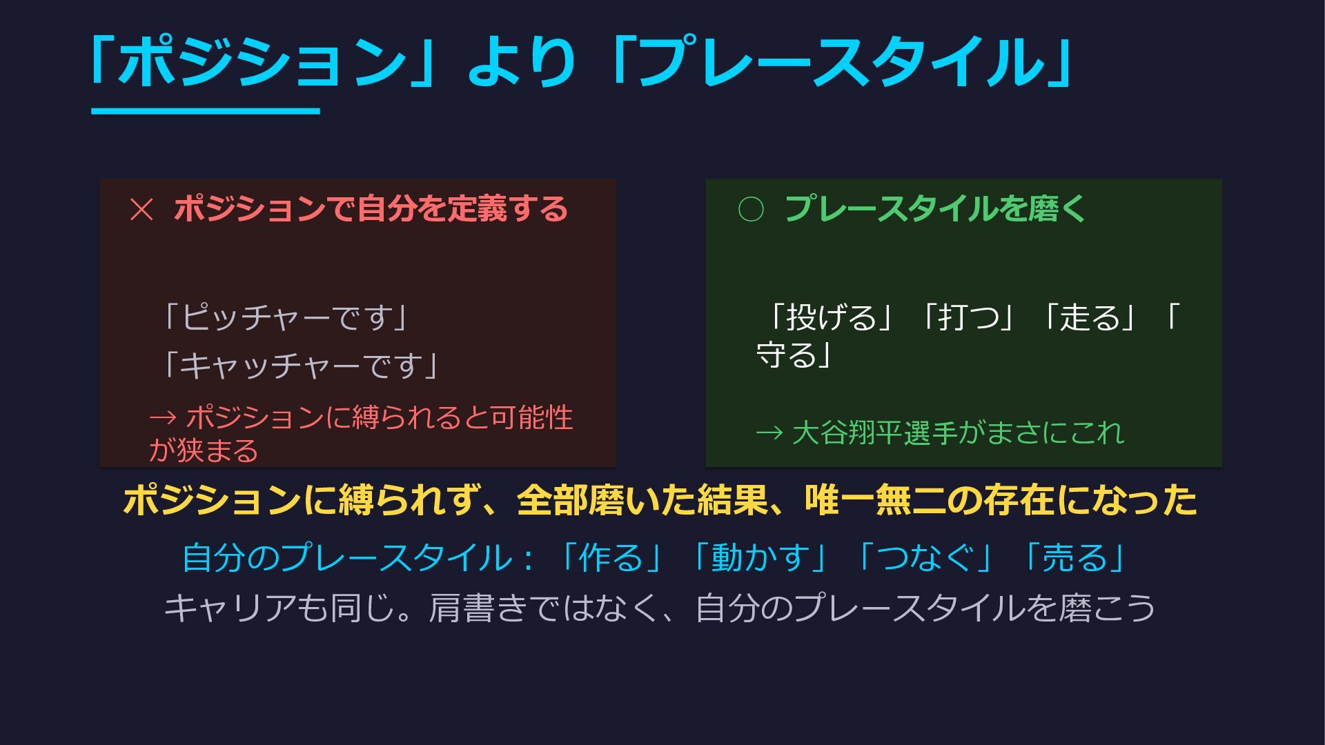 「投げる」「打つ」「走る」「 守る」 → 大谷翔平選手がまさにこれ ポジションに縛られず、全部磨いた結果、唯一無二の存在になった 自分のプレースタイル:「作る」「動かす」「つなぐ」「売る」 キャリアも同じ。肩書きではなく、自分のプレースタイルを磨こう