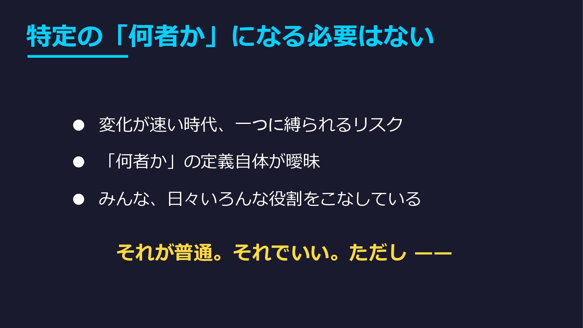特定の「何者か」になる必要はない • 変化が速い時代、一つに縛られるリスク • 「何者か」の定義自体が曖昧 • みんな、日々いろんな役割をこなしている それが普通。それでいい。ただし ——