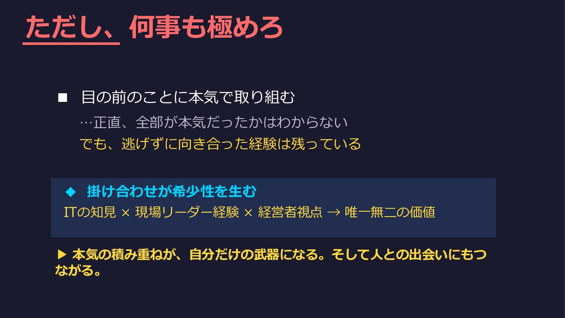 ただし、何事も極めろ ▪ 目の前のことに本気で取り組む …正直、全部が本気だったかはわからない でも、逃げずに向き合った経験は残っている ◆ 掛け合わせが希少性を生む ITの知見 × 現場リーダー経験