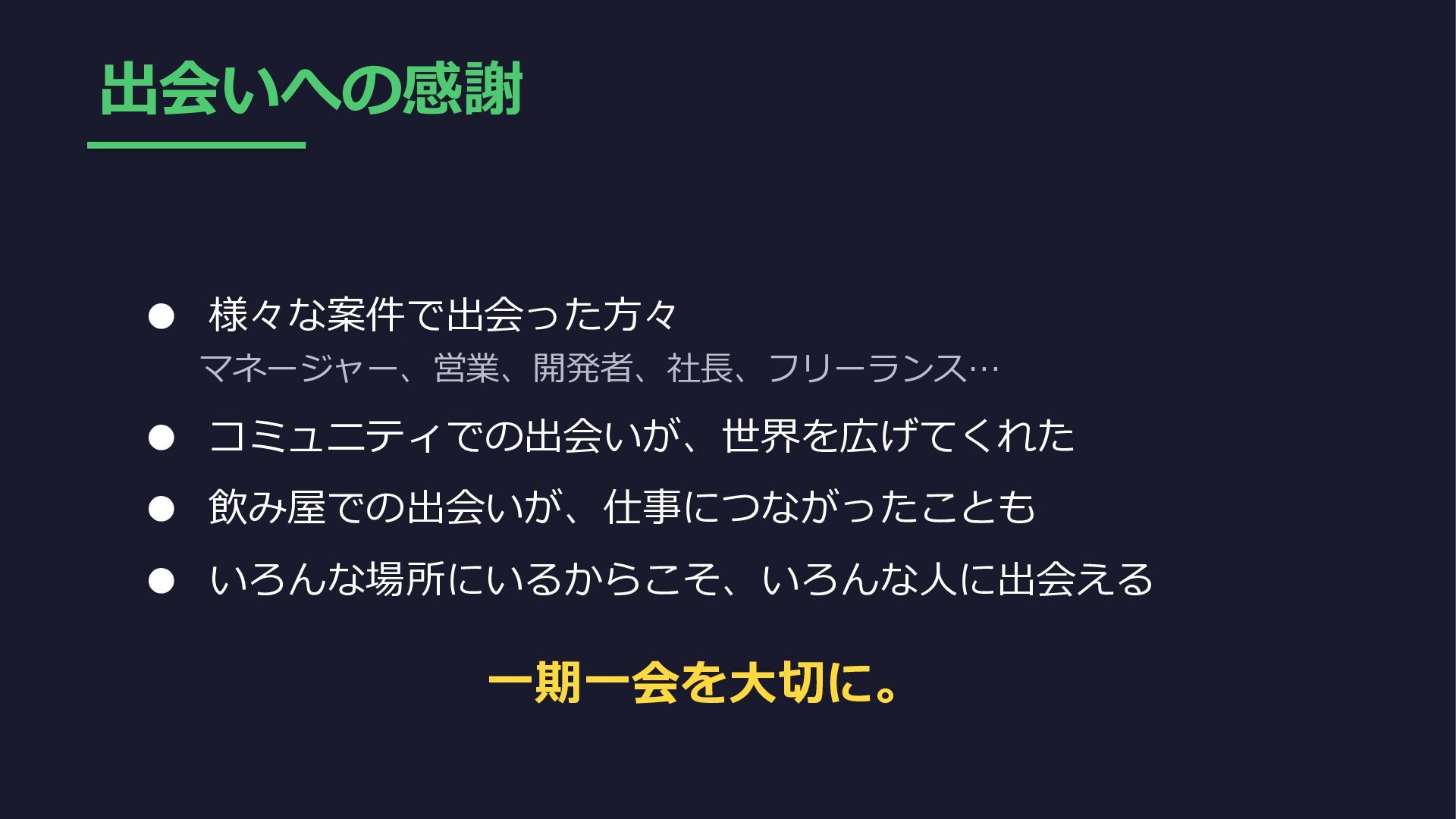出会いへの感謝 • 様々な案件で出会った方々 マネージャー、営業、開発者、社長、フリーランス… • コミュニティでの出会いが、世界を広げてくれた • 飲み屋での出会いが、仕事につながったことも • いろんな場所にいるからこそ、いろんな人に出会える