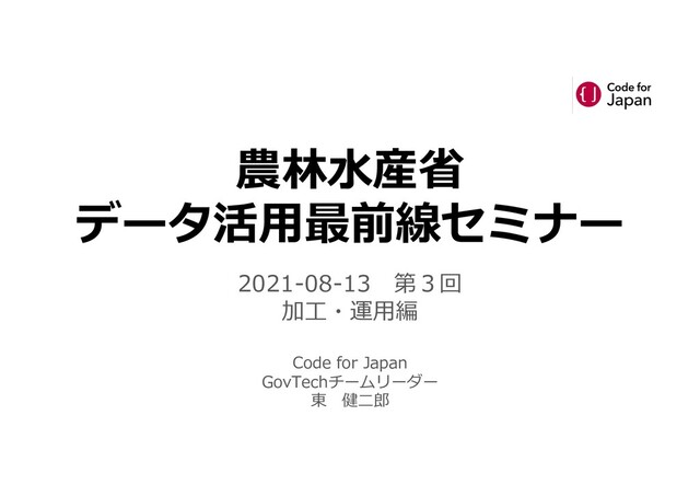 農林⽔産省 データ活⽤最前線セミナー 2021-08-13 第3回 加⼯・運⽤編 Code for Japan GovTechチームリーダー 東