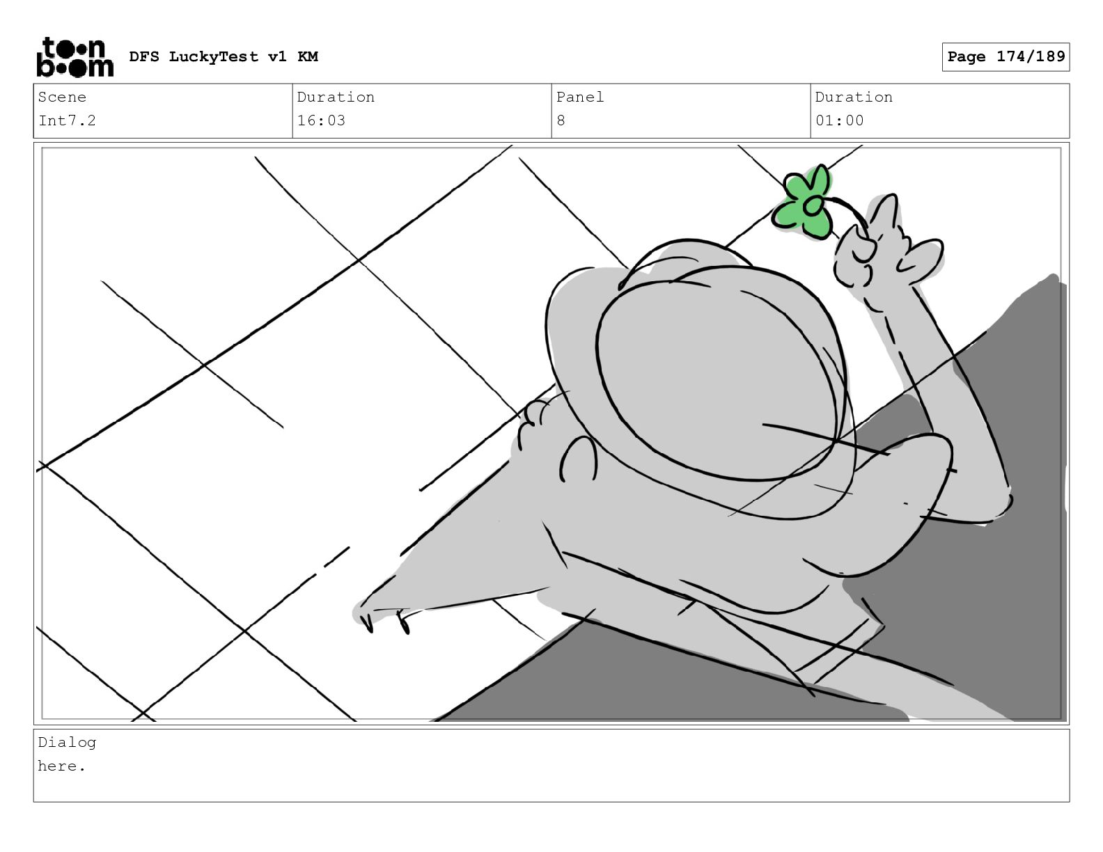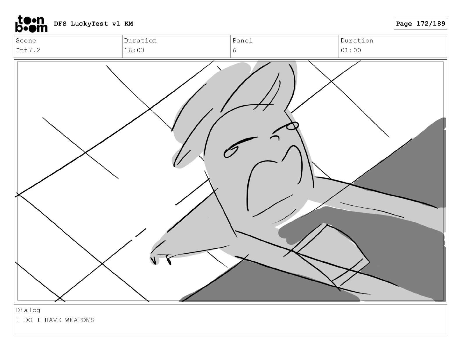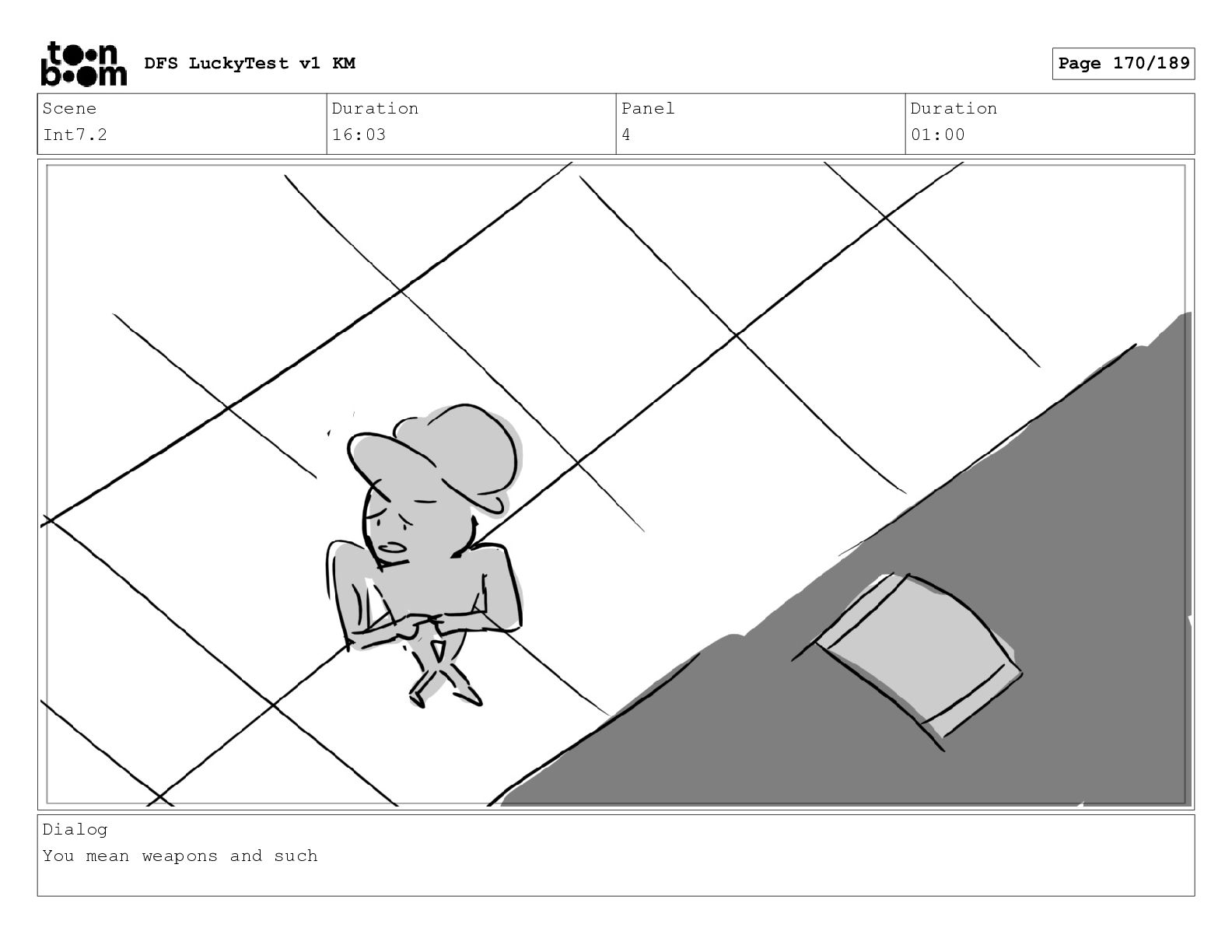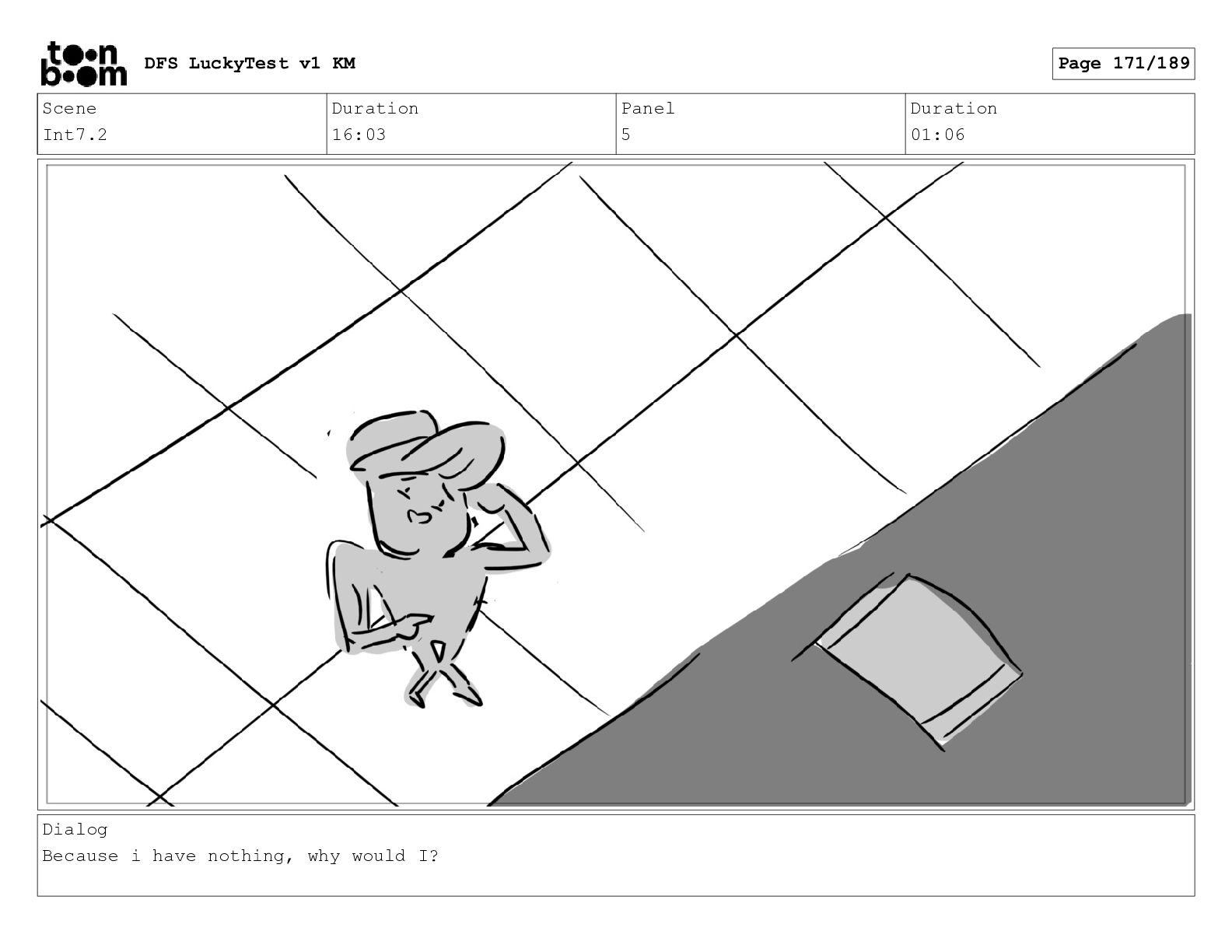 Scene Int7.2 Duration 16:03 Panel 8 Duration 01:00 Dialog here.